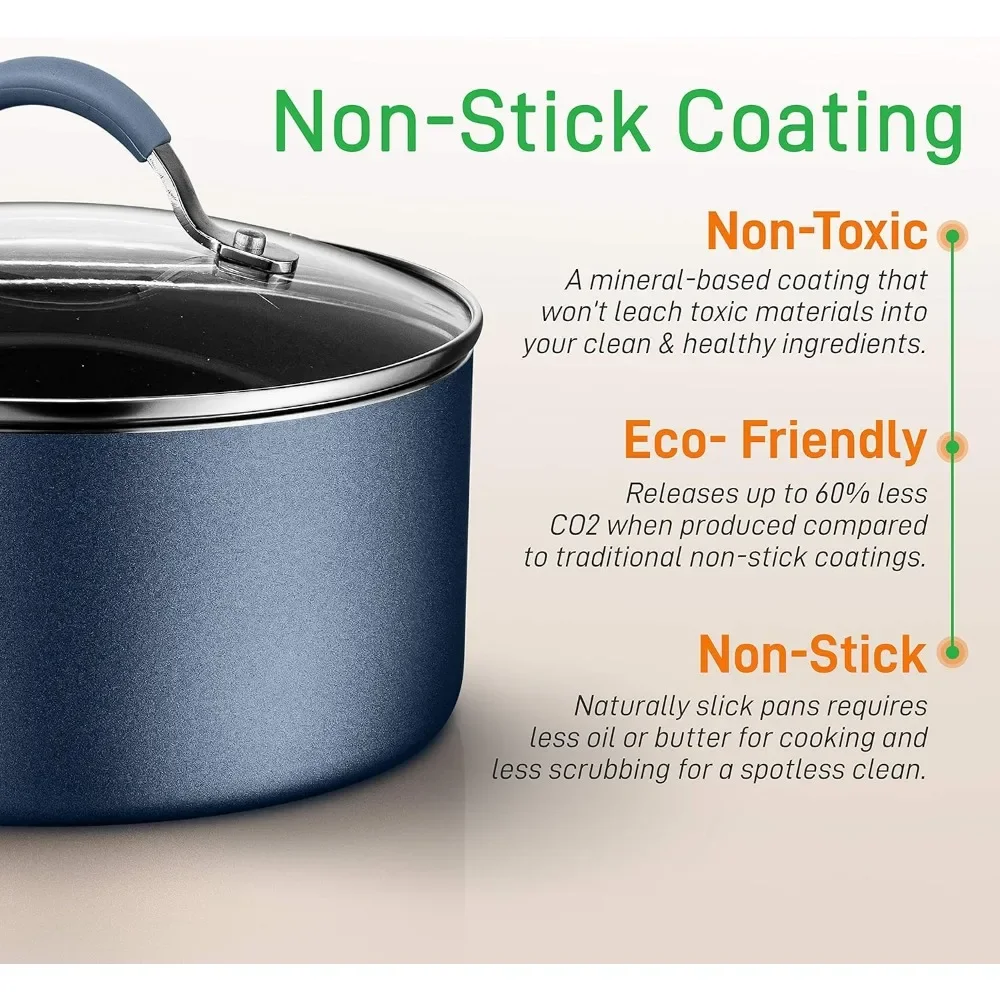 - NON-STICK COATING: The PTFE/PFOA/PFOS-free non stick pot set cooking ware features a long lasting nonstick coating for easy food release or tossing, cleaning & healthy cooking w/ heat resistant lacquer exterior making it resistant to high heat