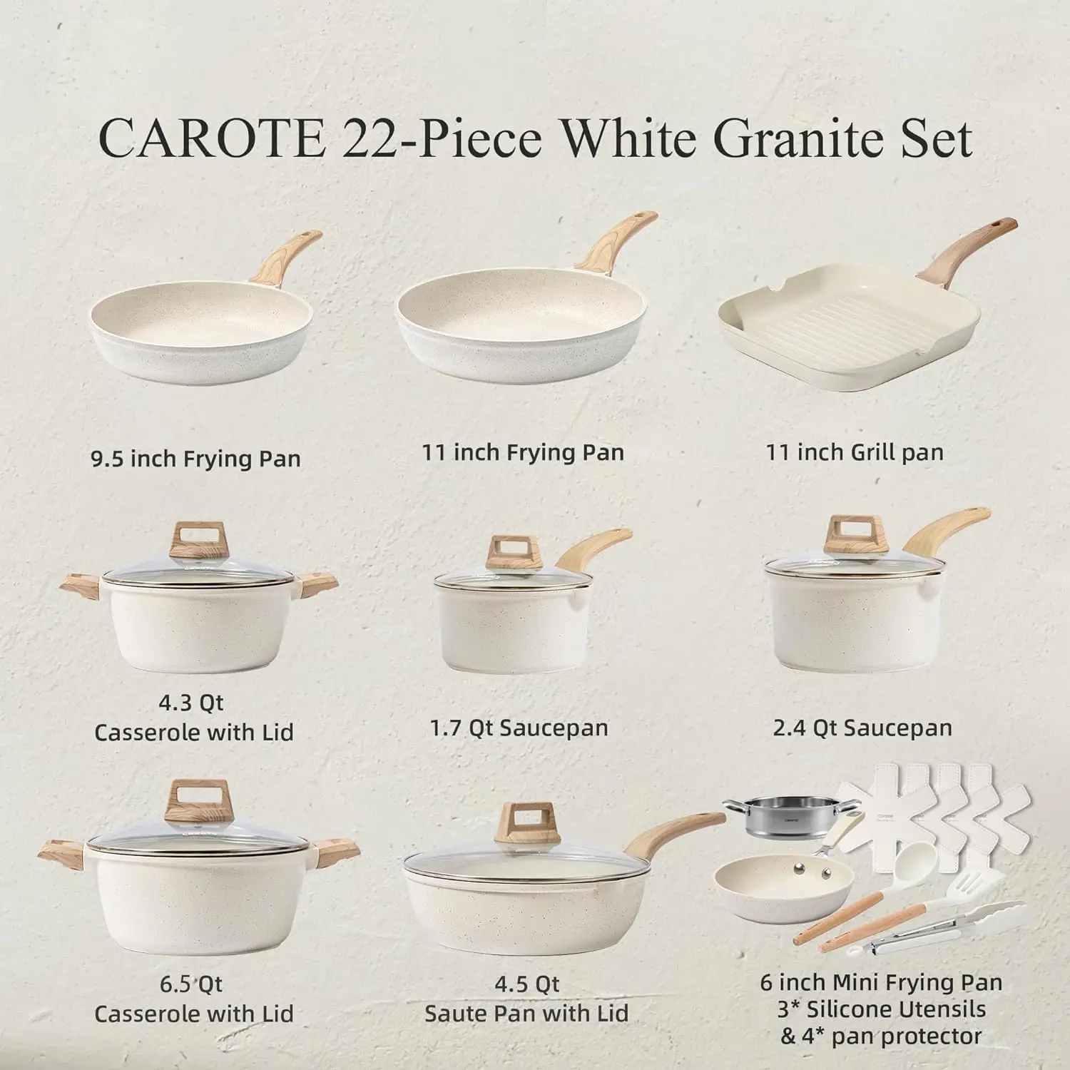 CAROTE 22-Piece Cookware Set Includes : 9.5/11 inch frying pan ,11inch Grill pan 4.5qt saute pan with lid,4.3/6.5 qt casserole with lid, 1.7/2.4qt saucepan with lid, 6inch mini pan ,3*utensils,4* pan protector .