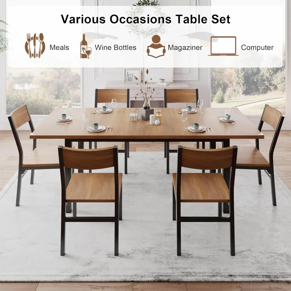 7-Piece Dining Room Table Set with 6 Chairs, 63" Extendable Dining Table & Chairs Set for 4-6, MDF Board & Metal Frame, Dinette