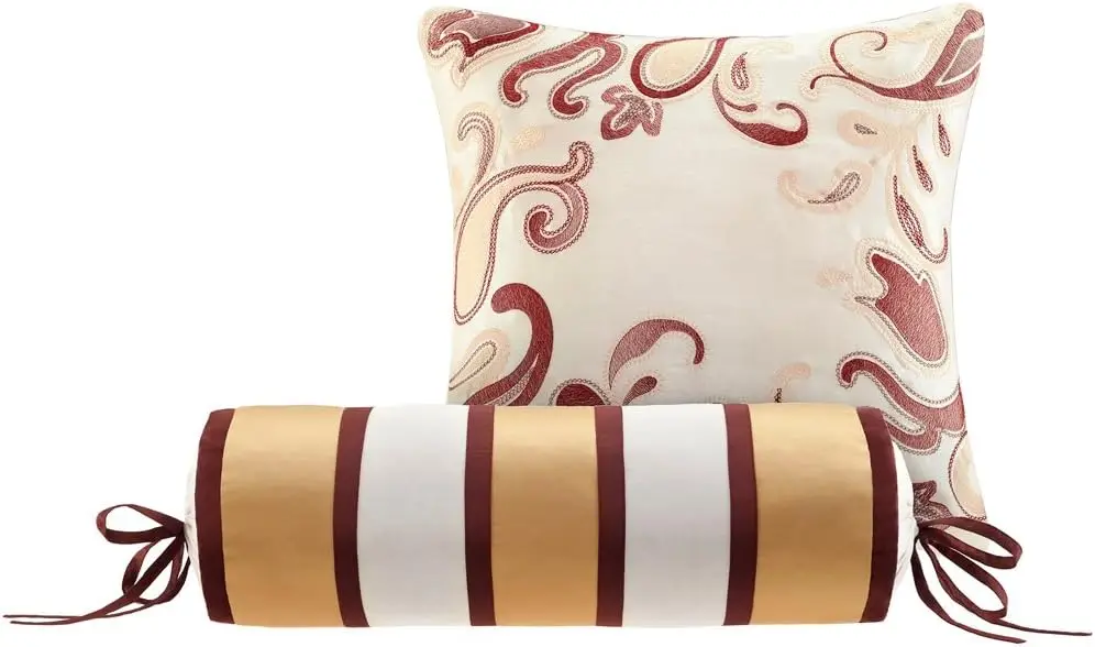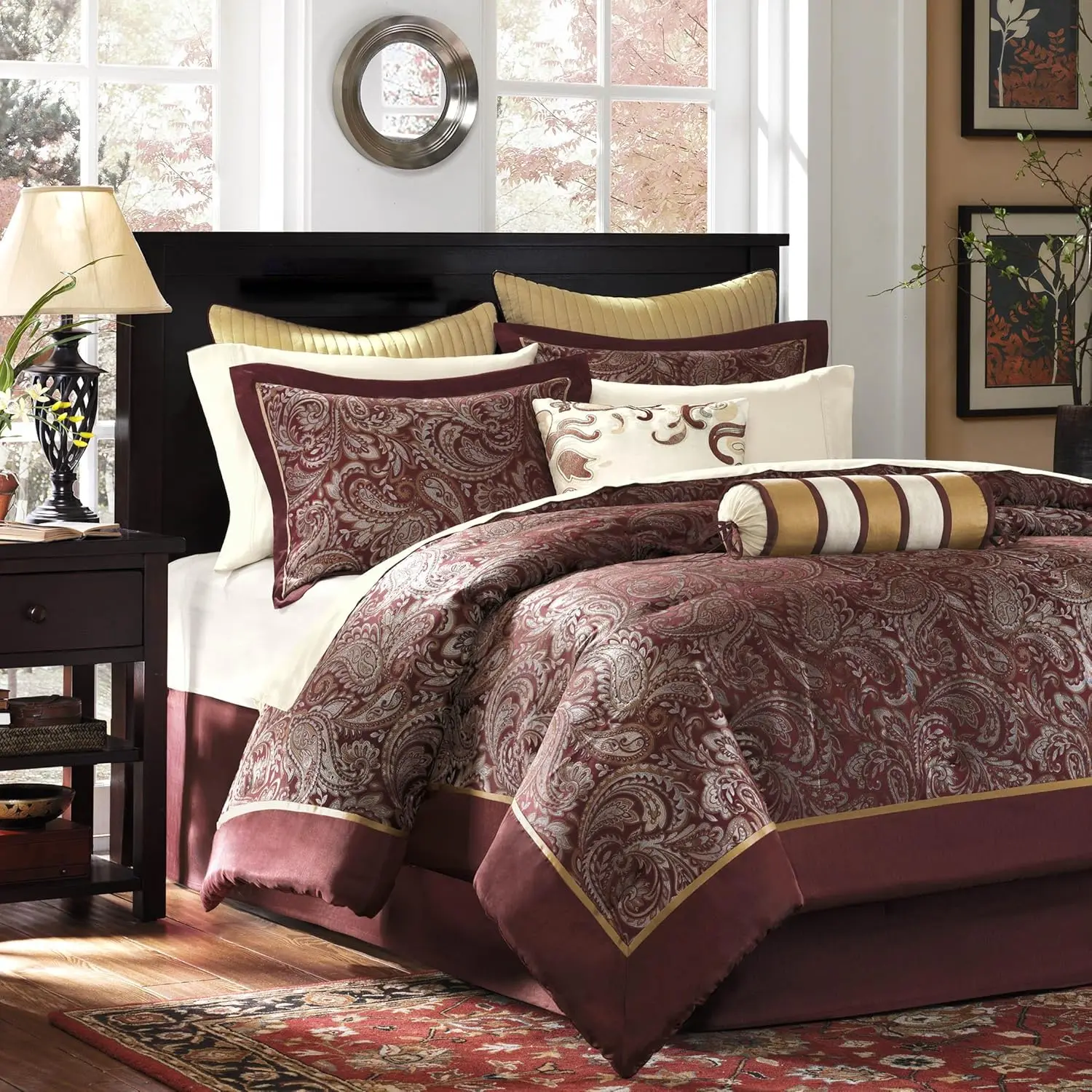 Comforter: 100% Polyester; Sheet Set: 100% Cotton Imported Traditional Bed in a bag comforter set design comes with all bedding essential you need to update your room décor The paisley jacquard weave is woven into a beautiful combination of burnt red, gold and a hint of platinum for a touch of sheen to your bedding Beautiful faux silk fabric is not only giving a natural sheen finish, but also wrinkle resistant and colorfast. Paired with a soft 100% cotton sheet set in complementing color to complete the design Set includes: 1 Comforter:106x92", 1 Bedskirt:72x84+15", 1 Flat Sheet:110x102", 2 Euro Shams:26x26", 2 Pillowcases:20x40", 2 King Shams:20x36+2", 2 Pillows:18x18"/6.5x18", 1 Fitted Sheet:72x84+14" Care instructions: Machine wash, delicate and separately; Tumble dry low; Spot clean decorative pillows Items in this set may come in rolled or compressed packaging and will need to be fluffed up