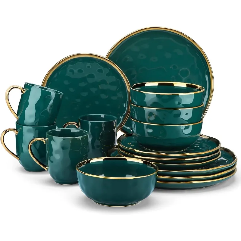 - 【HANDMADE AND MODERN DESIGN】Carefully crafted black stoneware. Inspired by stylish modern elements, the designer highlights the sophistication and elegance of black stoneware with a luxurious royal gold thread. This dinnerware set will give you a good appetite and a good mood