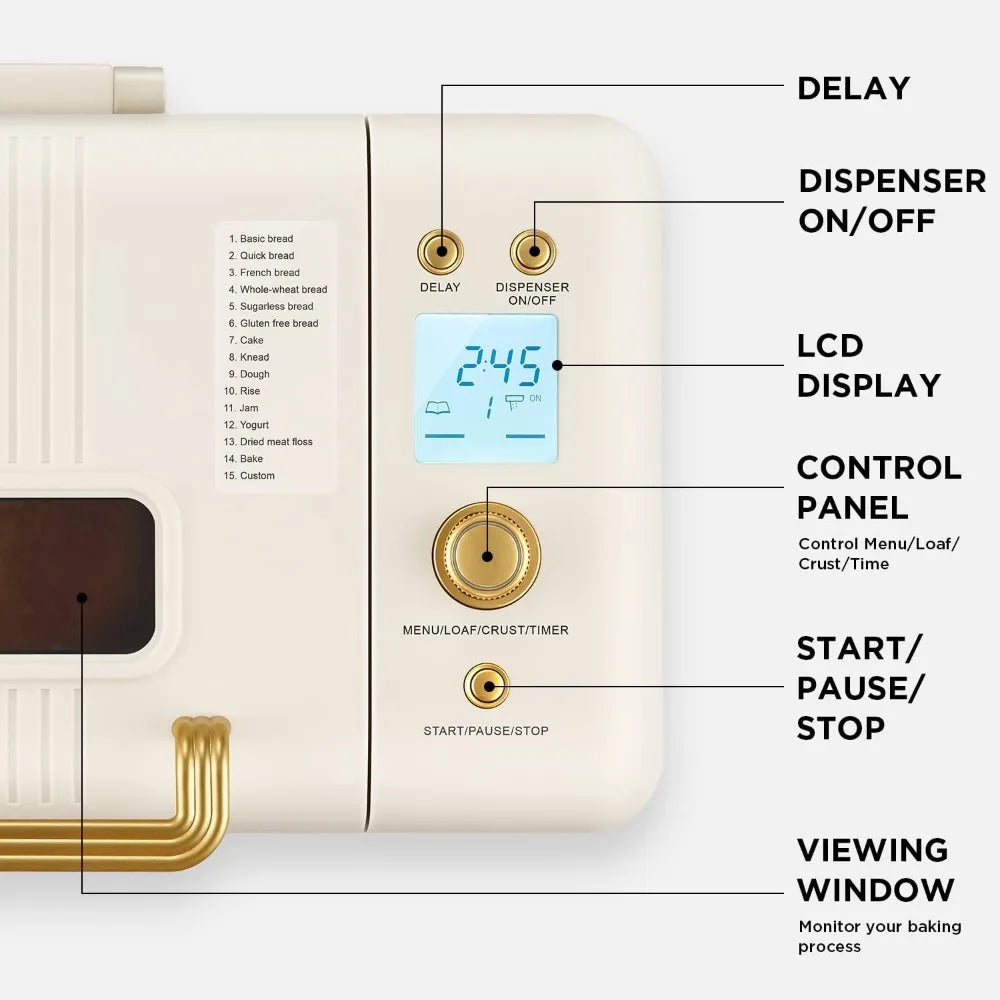 Humanized design - automatic mixing, intelligent fruit and nut dispenser, kneading ingredients through paddles, digital LCD display, easy to program: 15 hour timer, bread crust, bread size. The observation window provides you with a comprehensive view of the process, and the AC motor can reduce noise.