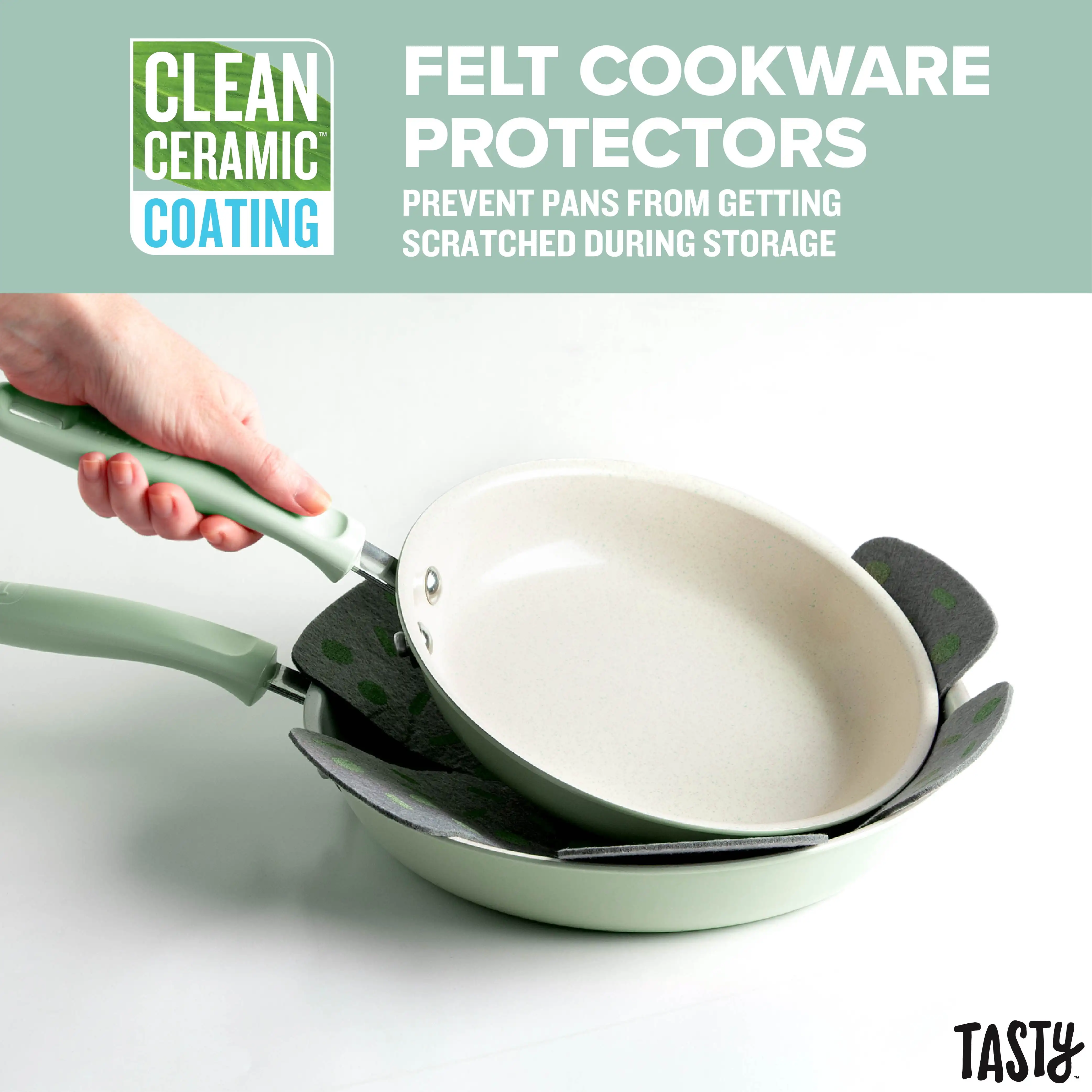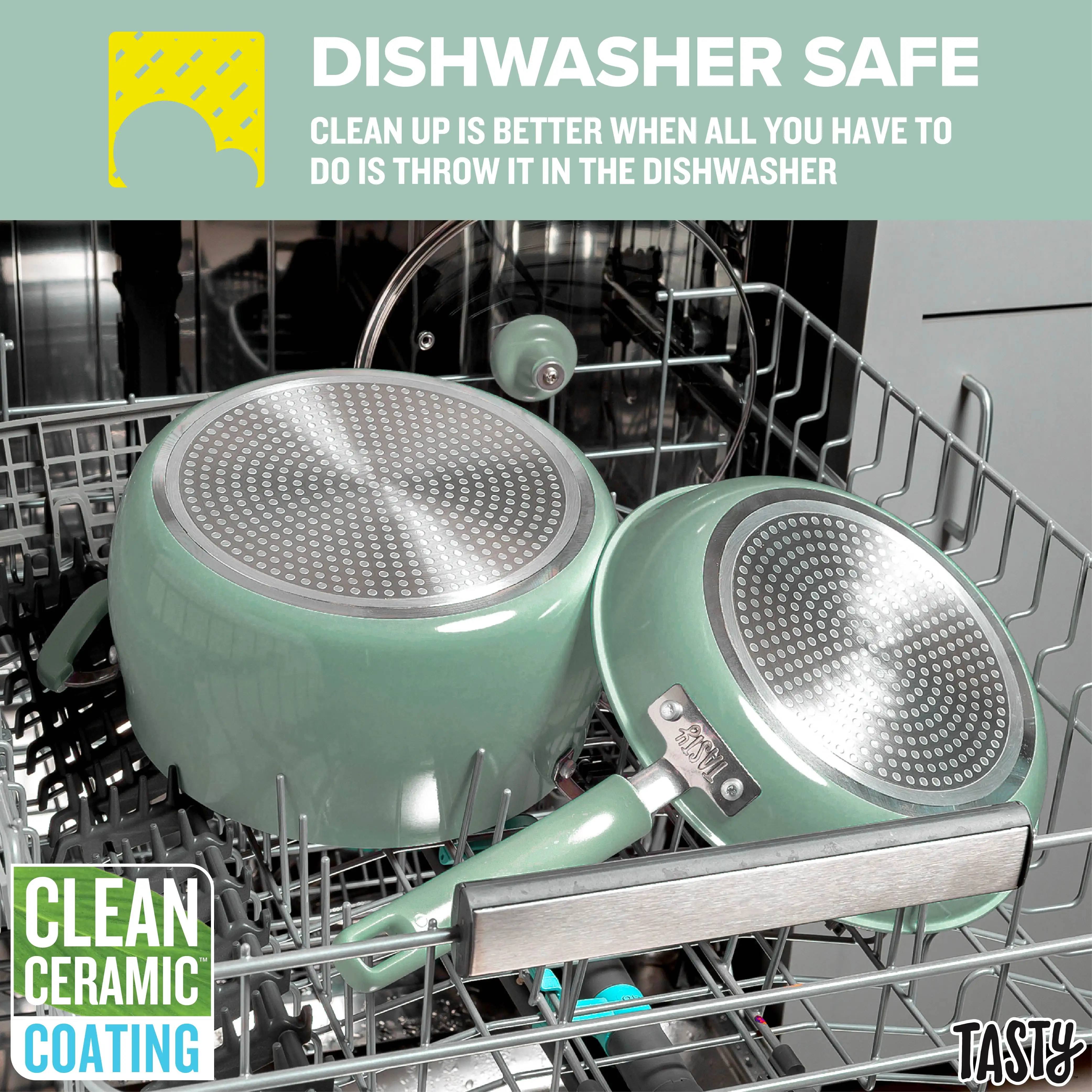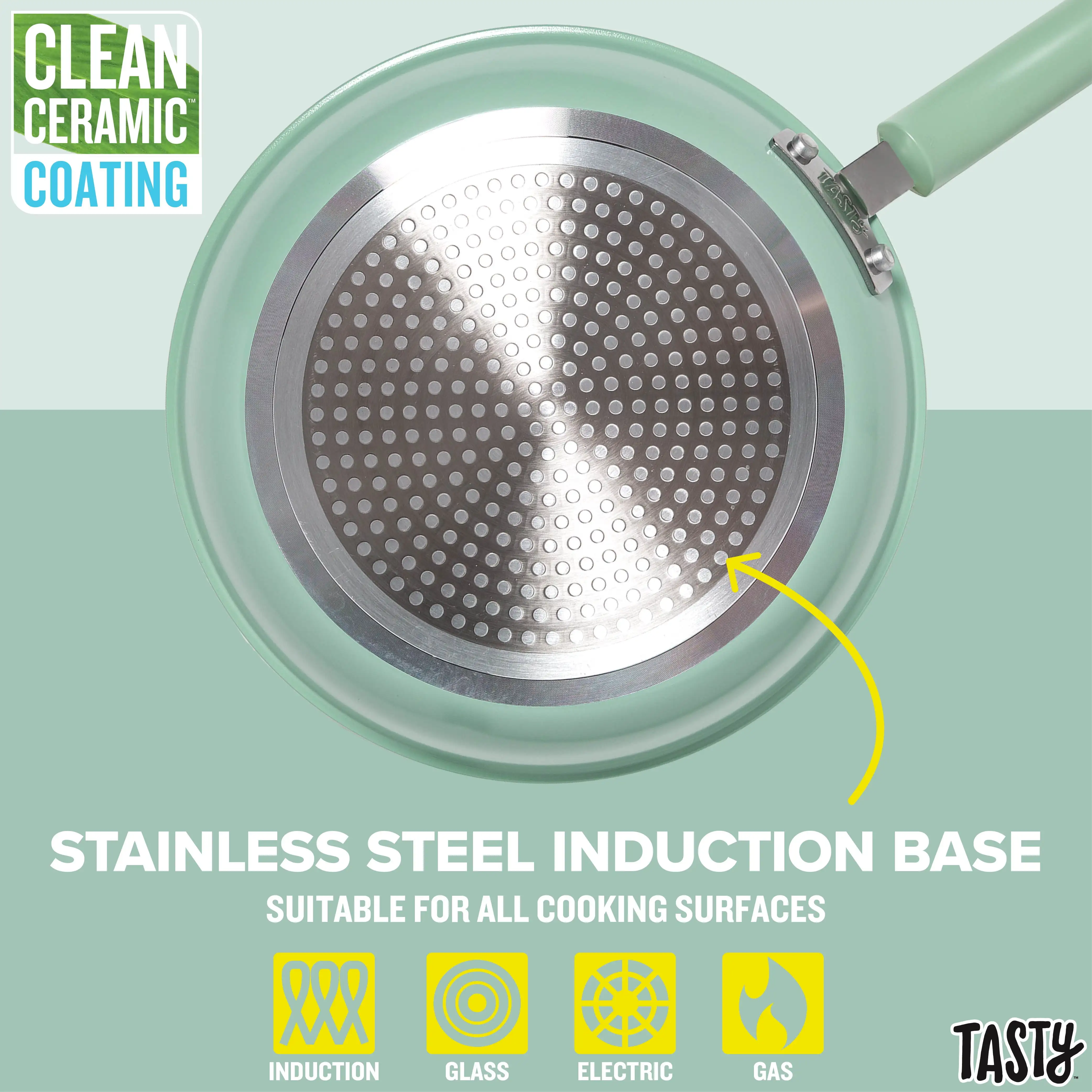 Better, Stronger, Longer-Lasting Non-Stick: This pots and pans set features a premium, reinforced Clean Ceramic non-stick coating that allows food to easily slide out of the pan Metal Utensil Safe: The durable non-stick is metal utensil safe, though we still recommend using silicone, wood or nylon tools when cooking A Pinch of This: Use the included ceramic bowls to pre-measure ingredients and make up sauces in advance to make cooking a breeze- comes in 6 ounce, 4 ounce and 2 ounce sizes Dishwasher Safe for Easy Cleaning: These pans are as easy to clean as they are to use and are dishwasher safe for fast and easy clean-up The Right Tools for the Job: The turner and spoon are heat resistant and safe to use on non-stick surfaces Awesome Quality: This cookware's heavy duty construction heats quickly and evenly Stack and Protect: Included cookware protectors (11.5 inch and 13.5 inch) are perfect for stacking and storing cookware without worrying about scratches Healthy Cooking: The ceramic non-stick coating is made without PFAS, PFOA, PTFE and PFOS Suitable for All Cooking Surfaces: Use this cookware on induction, electric, gas and glass! Pots and pans feature a stainless steel induction base Includes: 8 inch fry pan, 9.5 inch fry pan, 1.5 quart saucepan with glass lid, 2.5 quart saucepan with glass lid, 5 quart dutch oven with glass lid, 2 piece cookware protectors (11.5 inch and 13.5 inch), solid spoon, slotted turner, 3 piece ceramic prep bowls (6 ounce, 4 ounce and 2 ounce)