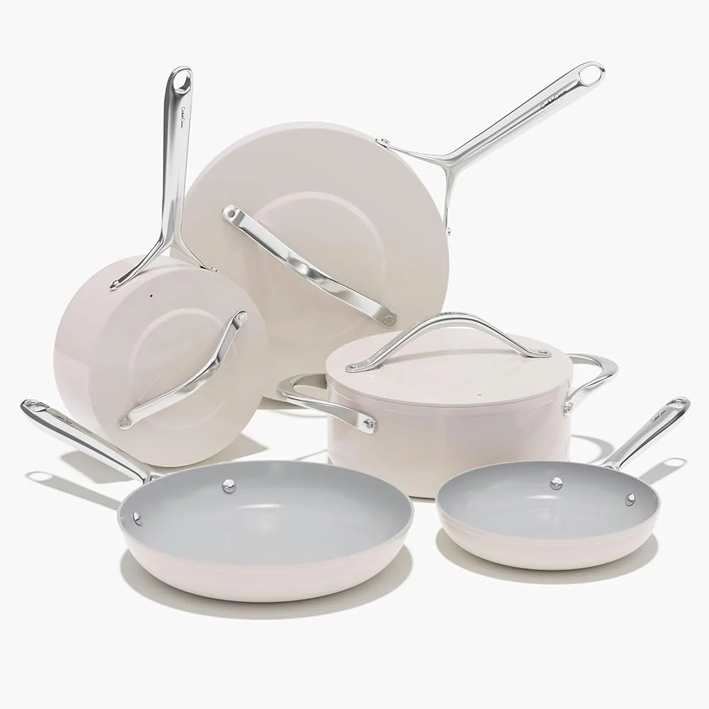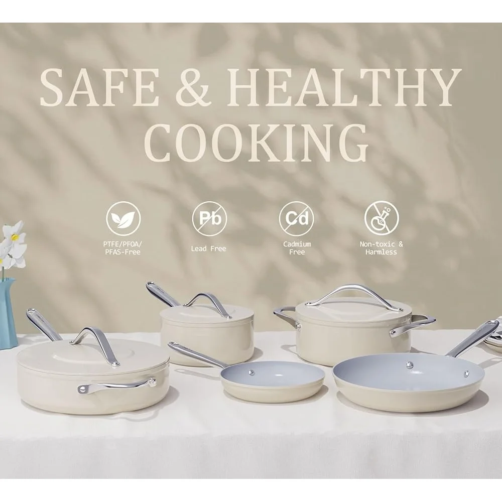 About this item Healthier cooking with 50% less oil – perfect for eggs, pancakes, or grilled cheese. Proven Safety: 800+ lab tests ensure zero chemical release even at 500°F. 𝗪𝗼𝗿𝗸𝘀 𝗼𝗻 𝗔𝗹𝗹 𝗦𝘁𝗼𝘃𝗲𝘁𝗼𝗽𝘀 – 𝗘𝘃𝗲𝗻 𝗜𝗻𝗱𝘂𝗰𝘁𝗶𝗼𝗻! - No More Cooktop Compatibility Issues: The high-magnetic stainless steel base heats 50% faster than regular pans (tested on gas, electric & induction cooktops). Oven & Dishwasher Safe: From stovetop to oven (up to 500°F), then toss in the dishwasher. 𝗘𝗳𝗳𝗼𝗿𝘁𝗹𝗲𝘀𝘀 𝗖𝗹𝗲𝗮𝗻𝘂𝗽 – 𝟭𝟬-𝗦𝗲𝗰𝗼𝗻𝗱 𝗪𝗶𝗽𝗲 - Nonstick That Lasts: The ultra-smooth ceramic surface releases food instantly – just rinse or wipe. No scrubbing, even after burnt cheese! ) and more time enjoying meals. 𝗦𝘁𝗮𝘆-𝗖𝗼𝗼𝗹 𝗛𝗮𝗻𝗱𝗹𝗲 & 𝗖𝗵𝗲𝗳-𝗜𝗻𝘀𝗽𝗶𝗿𝗲𝗱 𝗚𝗿𝗶𝗽 - Upgraded Y-Shaped Handle: 50% better heat insulation than traditional pans – no burns or slips, even when flipping omelets. Left/Right Hand Friendly: Lightweight yet sturdy for precise control. 𝗗𝘂𝗿𝗮𝗯𝗹𝗲 𝗖𝗮𝘀𝘁 𝗔𝗹𝘂𝗺𝗶𝗻𝘂𝗺 - Built to Last: Heavy-duty die-cast aluminum core ensures even heating and resists warping. 3X thicker coating vs. cheap nonstick pans. 𝐒𝐭𝐞𝐚𝐦 𝐂𝐨𝐧𝐭𝐫𝐨𝐥 & 𝐅𝐥𝐚𝐯𝐨𝐫 𝐋𝐨𝐜𝐤 𝐋𝐢𝐝 - Vented lid prevents boil-overs while trapping moisture. Aluminum lid with flavor channels circulates condensation back into food, intensifying taste like a professional basting tool. 𝐄𝐥𝐞𝐯𝐚𝐭𝐞 𝐘𝐨𝐮𝐫 𝐂𝐨𝐨𝐤𝐢𝐧𝐠 - The Ceramic Cookware Set includes an 8-inch frying pan, a 10-inch frying pan, a 3QT saucepan with Lid, a 4. 5QT casserole pot with Lid, and a 4. 5QT sauté pan with Lid - a must-have collection of nonstick cookware sets for common, everyday cooking. Material: Aluminum Color: Cream Brand: Size: Standard Handle Material: Stainless Steel
