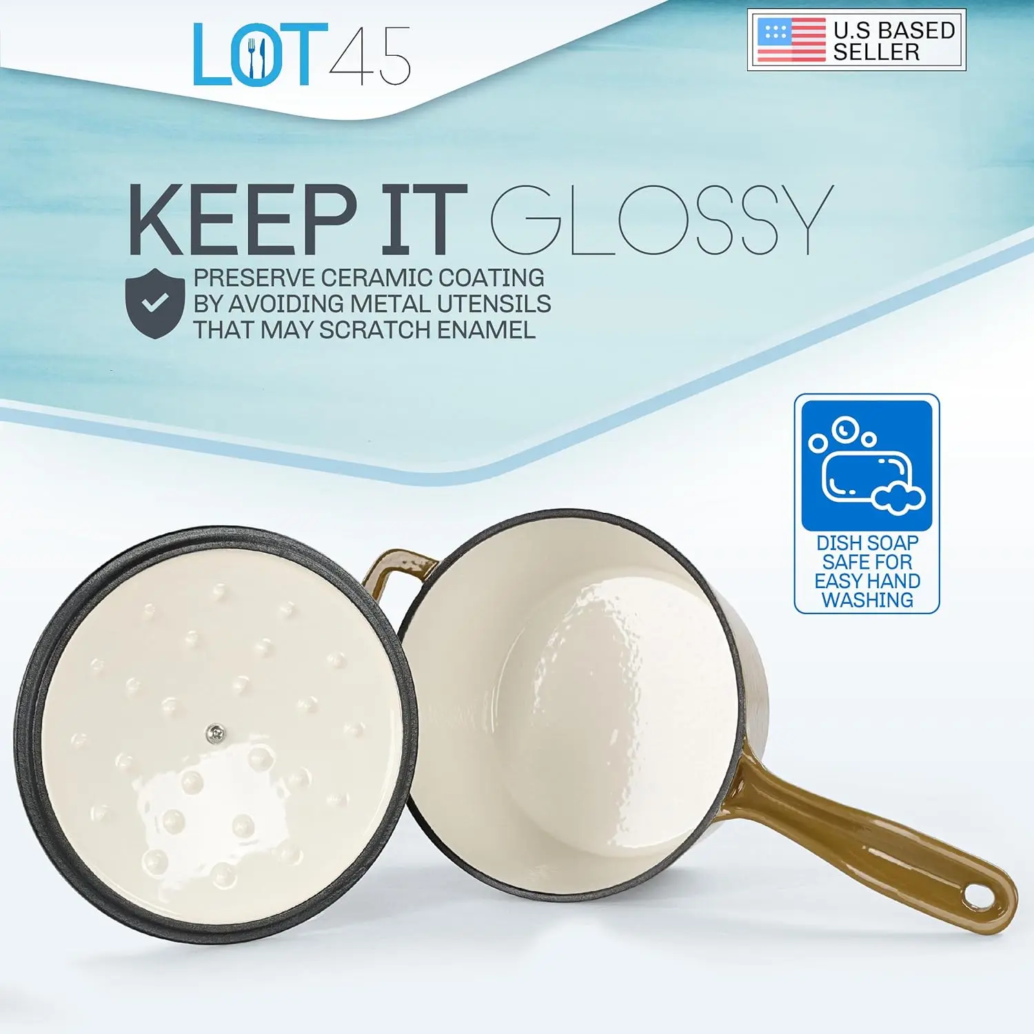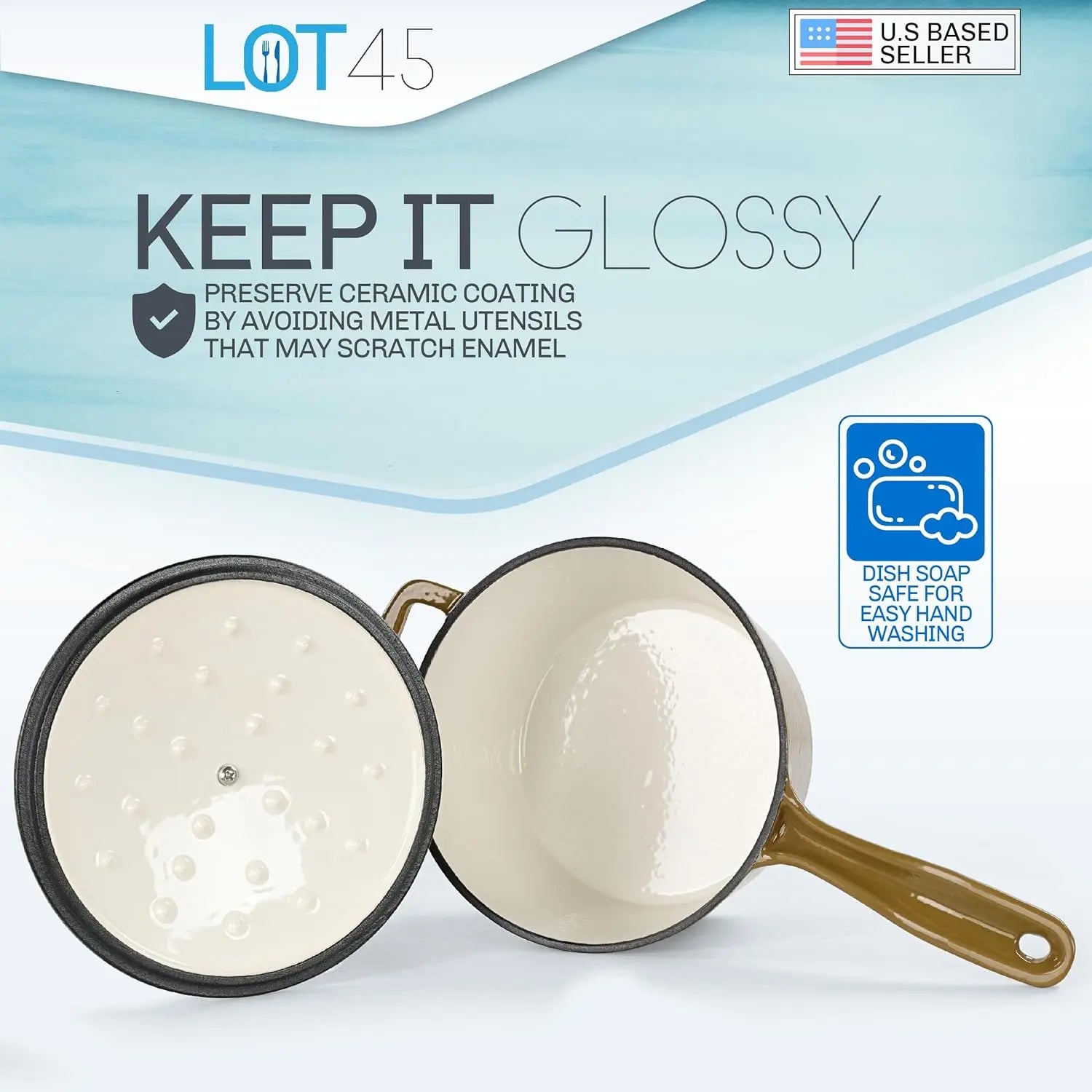 - [Non-Stick Surface]: Glossy, smooth finish makes your enameled cast iron skillet and Dutch oven pots easy to use; Enamel coating is non-stick and allows for quick soap safe cleaning