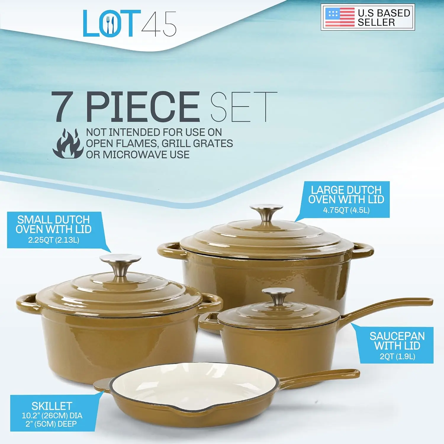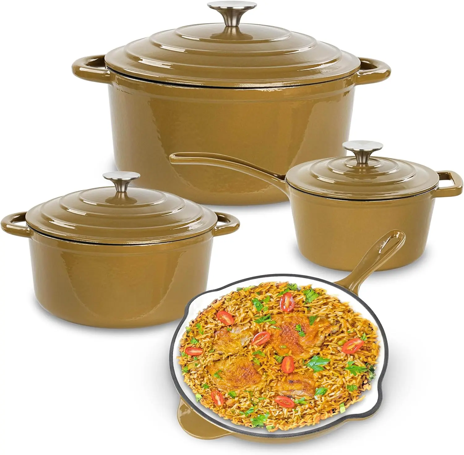 - [7 Piece Set]: 4.75qt (4.5L) large Dutch oven with lid, 2.25qt (2.13L) small Dutch oven with lid, 2qt (1.9L) saucepan with lid, 10.25in (26cm) diameter 2in (5cm) deep skillet