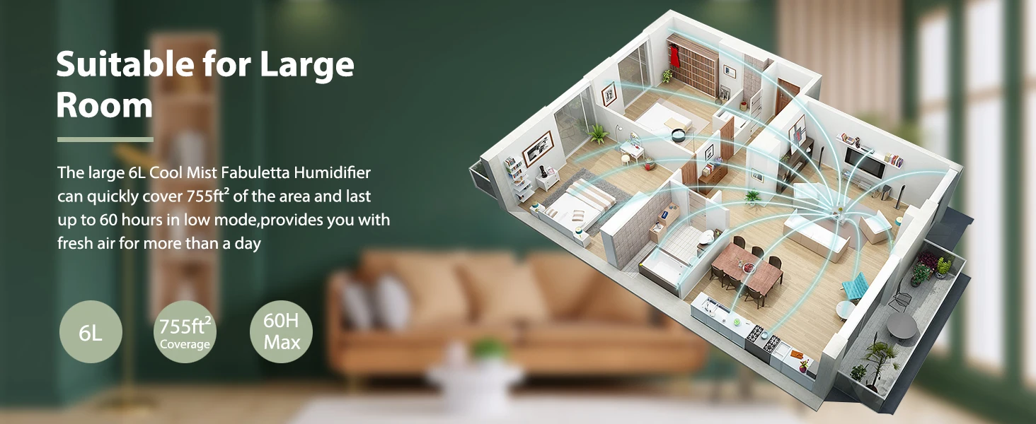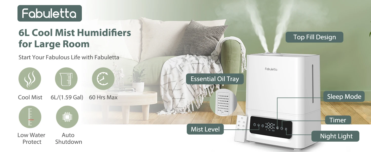 FABULETTA Humidifiers for Bedroom, 6L Cool Mist Humidifiers Top Fill Essential Oil Diffuser for Baby
