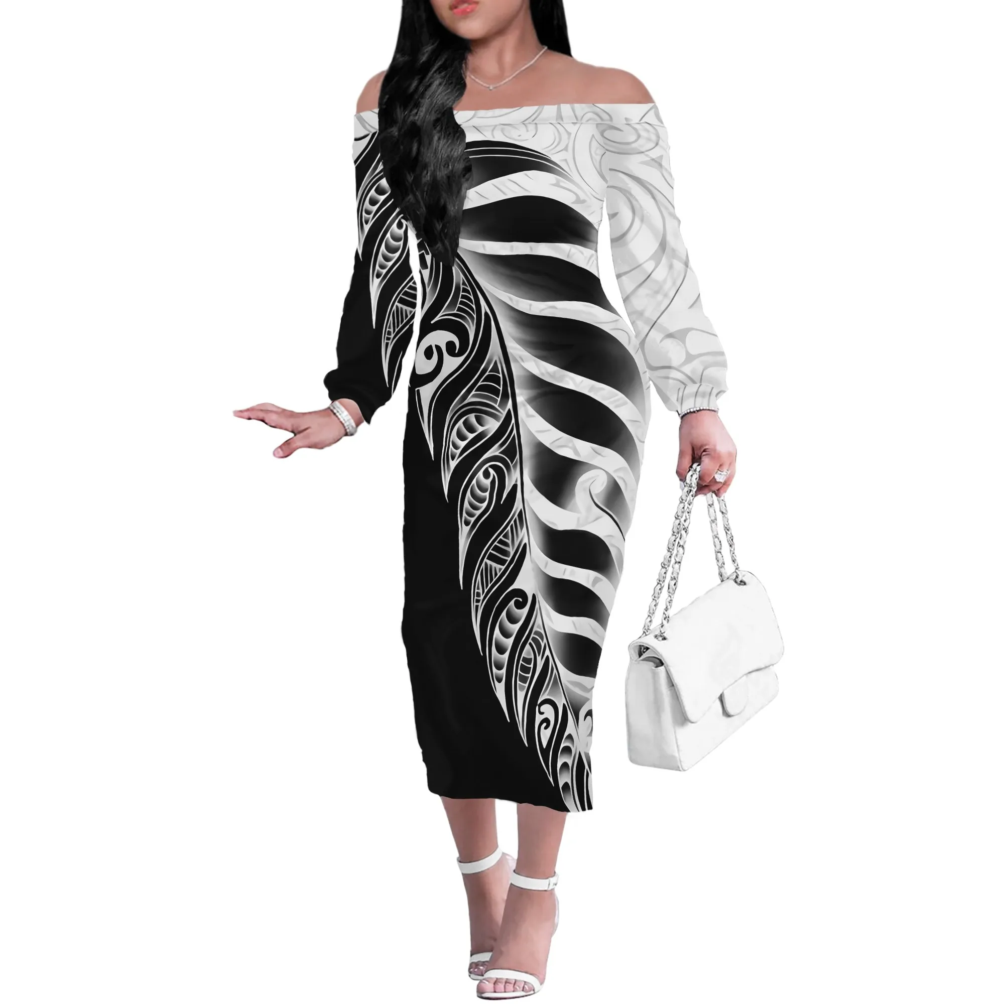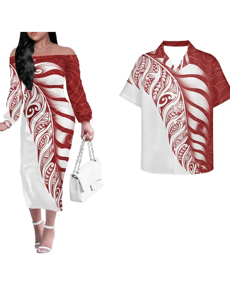 Factory Price Personality Red-black Party Off Shoulder Dress Custom Polynesian Tribal Tattoo Pattern Large Size 4XL Sexy Dress