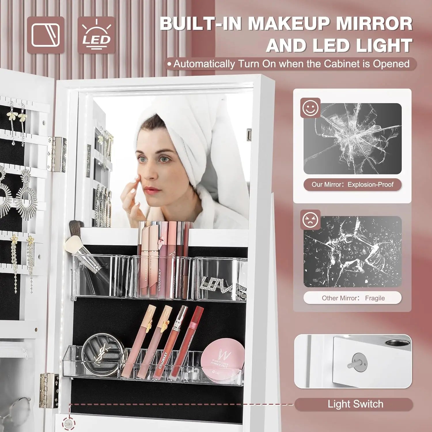 - Built-in Makeup Mirror with Auto LED light: When you open the cabinet door, the LED light strip provides adequate lighting around the built-in makeup mirror, also can lighting up most jewelries for your quick pick up proper fashion accessories that fit your dress up, good for creating delicate makeup look. Kindly please note the LED are powered by 3 AA batteries which are not provided in package.