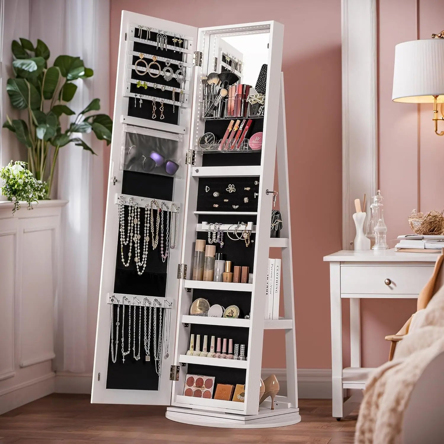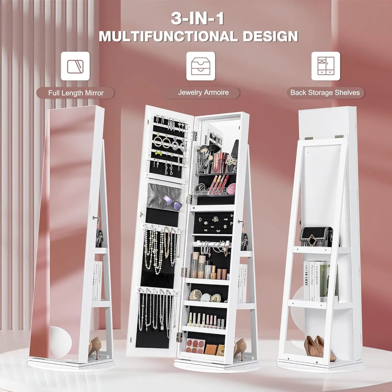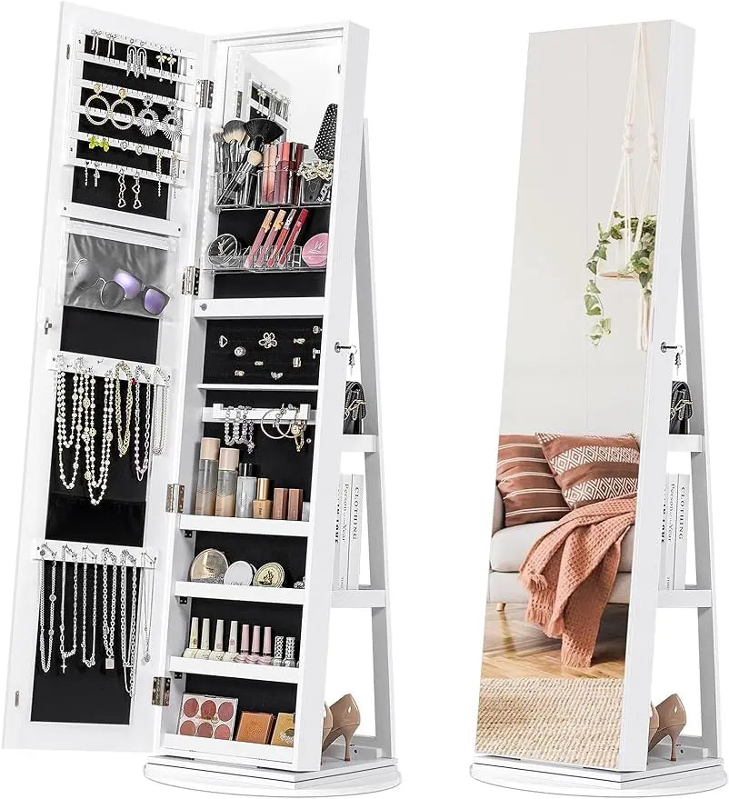 - 3-in-1 Mirror Jewelry Cabinet: Our jewelry mirror cabinet has a multifunctional design,by owning it, you will get a full length mirror , a jewelry armoire and storage shelves. The front of the cabinet is a full-length mirror, which can be opened to store all kinds of jewelry and cosmetics. Mirrored cabinet doors effectively hide the internal storage space,beauty and utility coexist.