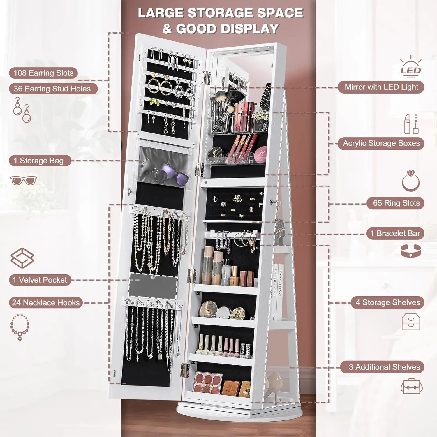 - Super Storage Capacity: The large capacity jewelry cabinet keeps your jewelries in an organized manner, omit getting tangled or twisted, with 108 earring slots, 36 earring stud holes, 1 storage bag, 24 necklace hooks, 1 velvet pocket, acrylic storage boxes, 65 ring slots, 1 bracelet bar, 4 storage shelves, 3 additional shelves. Optimal structure designed for very practical usage, easy access and lockable.