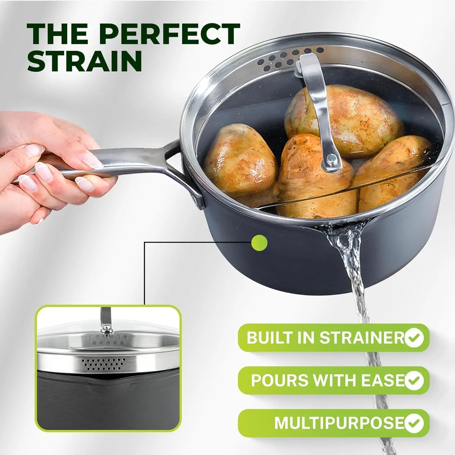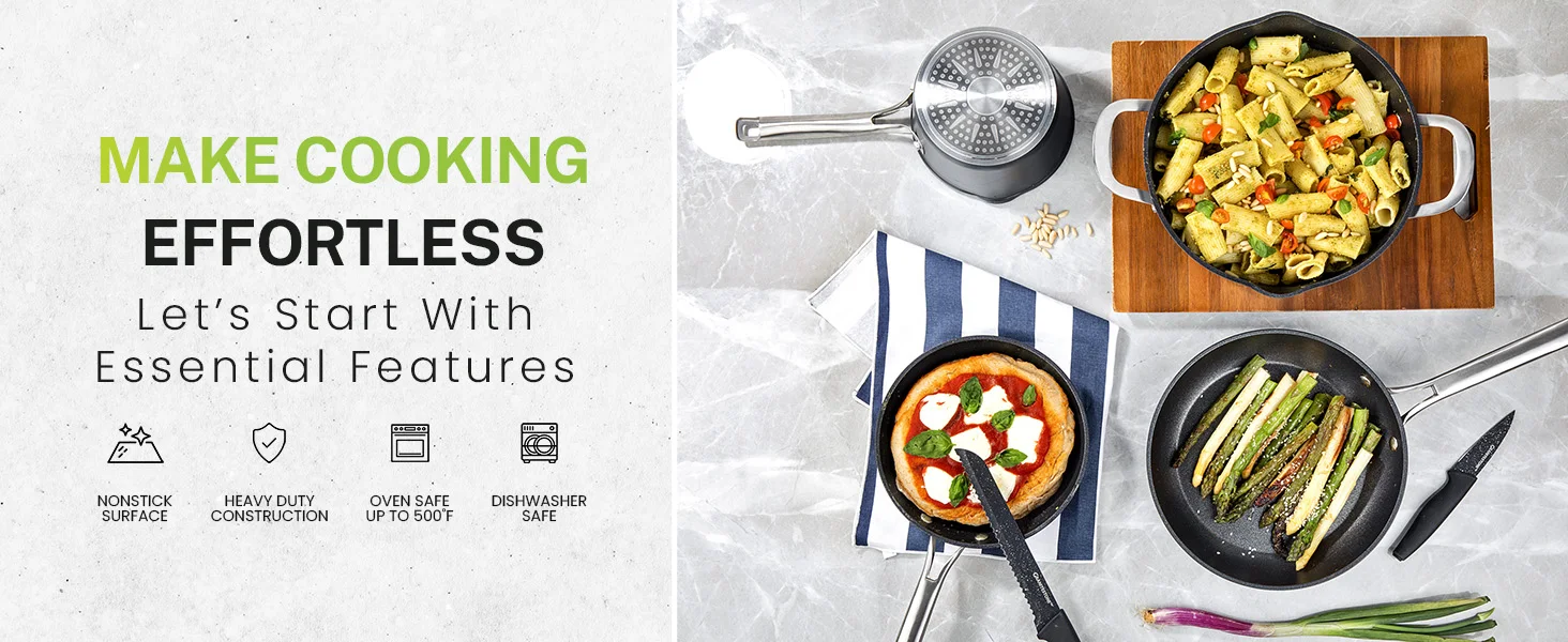 QUICK AND EVEN HEATING: Forged from a single sheet of hard anodized aluminum, each piece of cookware quickly and evenly conducts heat from end to end, ensuring there are no dead zones or hot spots and providing deliciously and perfectly cooked foods day in and day out.