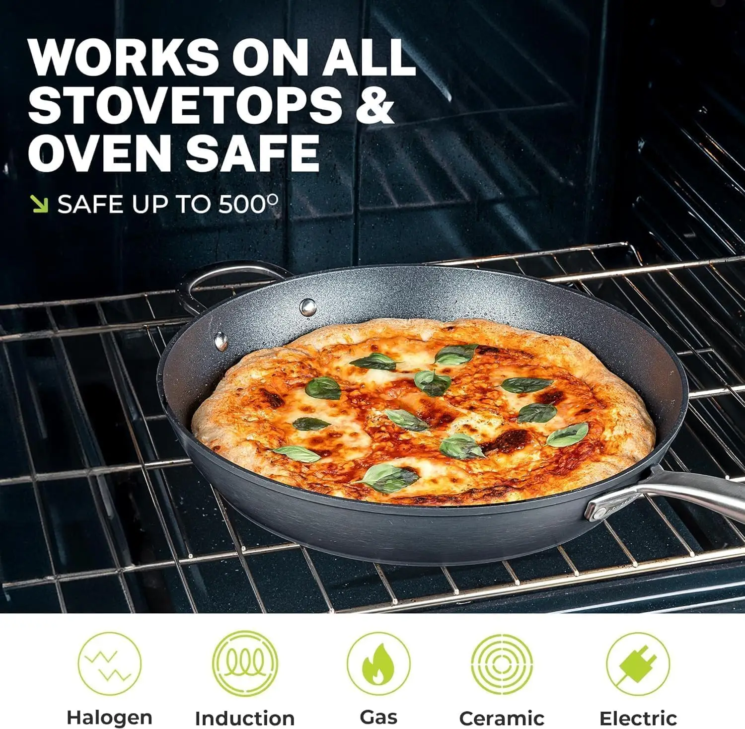 - INDUCTION COMPATIBLE: Granitestone Armor Max is compatible with all types of stovetops- Induction, gas, electric, halogen, and ceramic – and is oven safe up to 500 Degrees, allowing you to cook virtually anywhere you’d like.