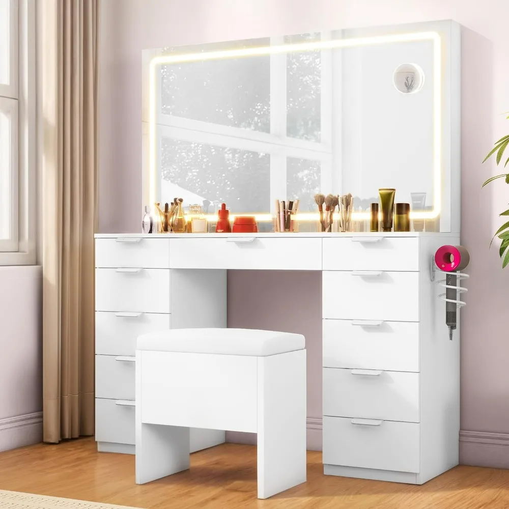 Makeup Vanity Desk Set ,with Mirror, Glass Tabletop, 11 Drawers, Power Strip, Hair Dryer Rack, and Storage Stool for Bedroom