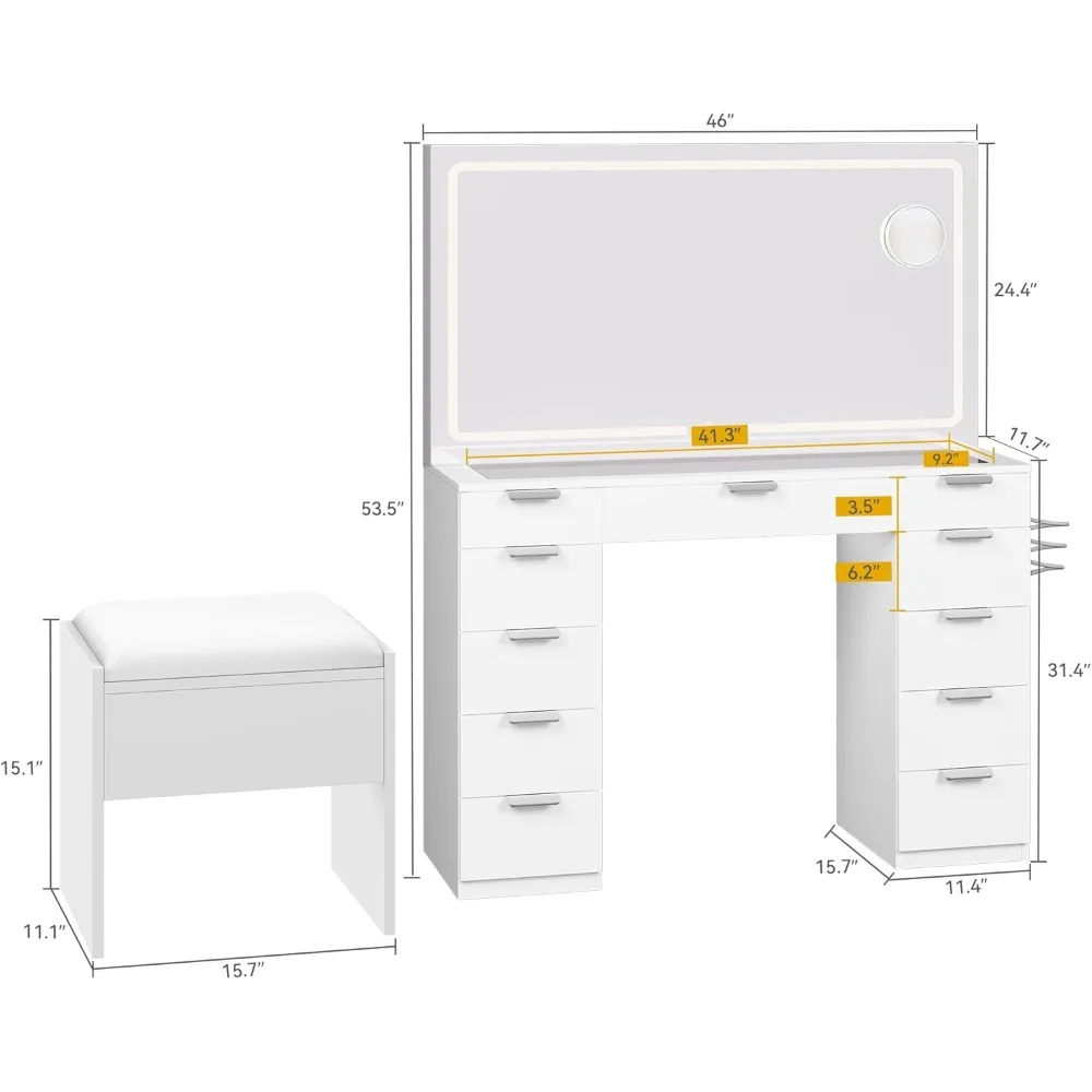 - Easy Setup: The makeup desk measures 46" x 11.7" x 55.9" (L x W x H), and the stool is 15.7" x 11.1" x 15.1" (L x W x H); All parts and accessories are labeled, and the package includes step-by-step instructions for quick setup