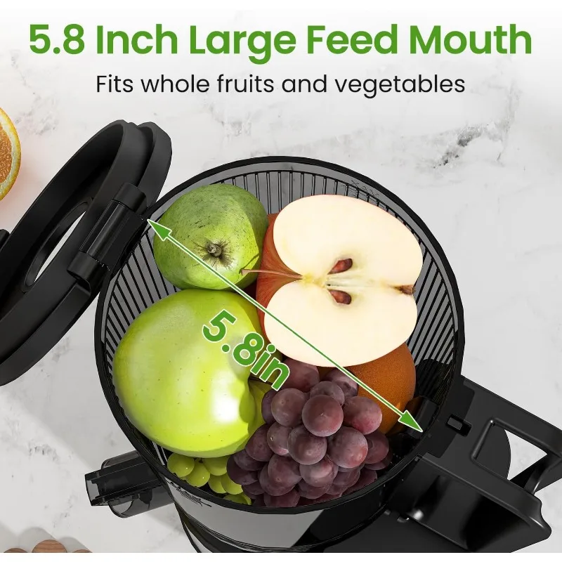 - 【5.8-inch Extra-larger Feed Chute】The 5.8-inch larger feed chute supports whole fruit entry into the juicer, ensuring anti-oxidation and safer operation. No worry about hurting your hands.