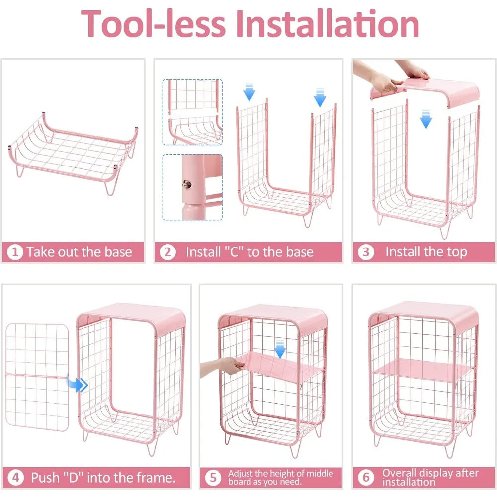 Metal Side Table,Cute Pink Nightstand,3 Tier End Table with Storage
