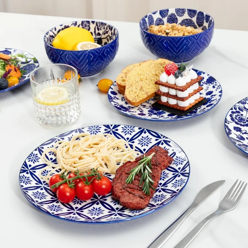 - Space-Saving: The blue and white dishware set create a modern and luxurious table setting. a smooth surface enhances ease of handling and the unique external embossed texture creates a more advanced and unique quality of life, but also allows for efficient stacking, neatly nesting in your cupboard or shelves.