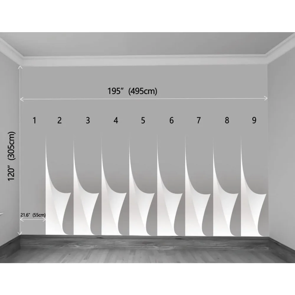 - Dimension This mural wallpaper is cut into 9 pieces for easy installation, each in 21.6"x120",total size is 195"x120"(495x305cm)(W x H). Each piece is marked with a number. You can place it in order during install it.