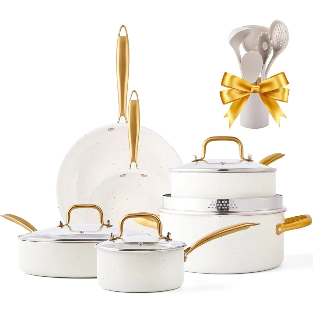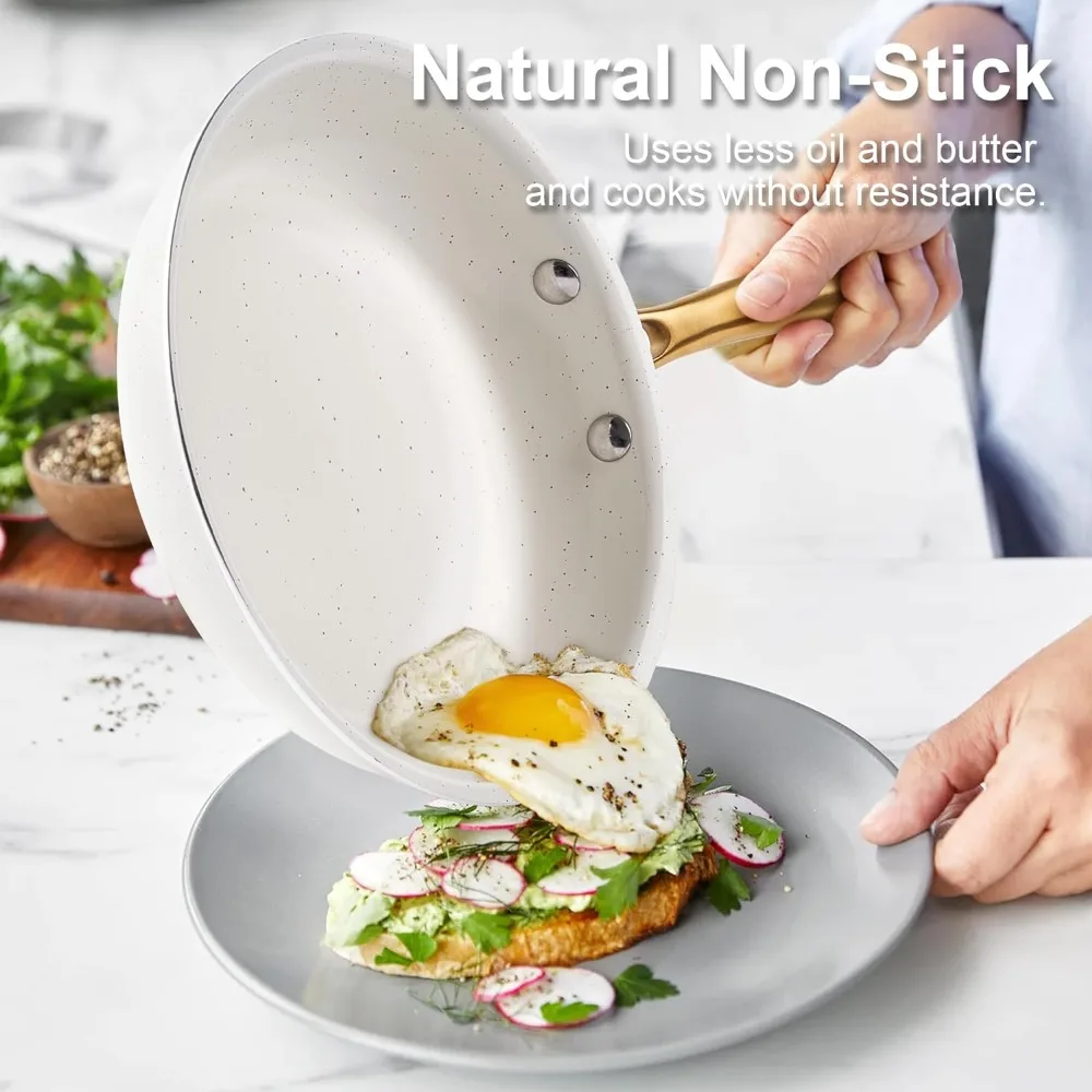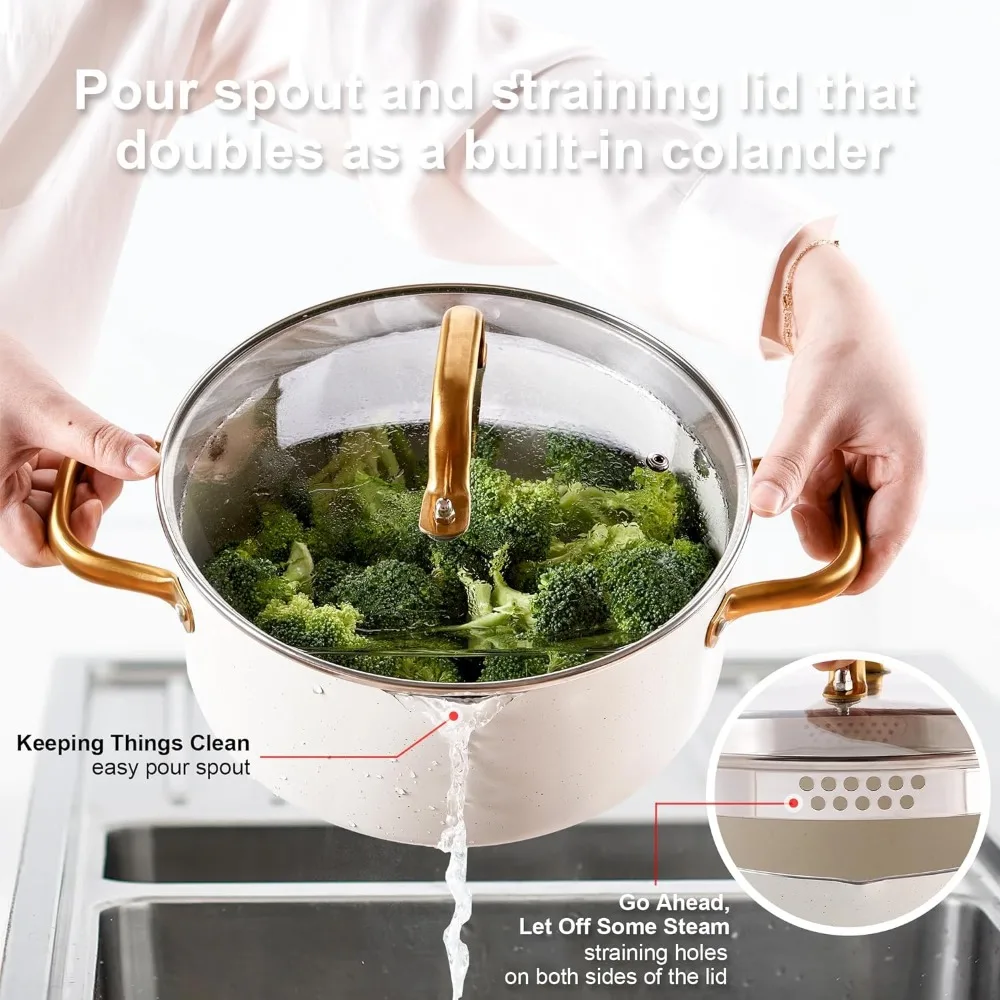 - 【Non-toxic Coating】- VONIKI pots and pans set nonstick are free of PTFE, PFOA, PFAS, lead, cadmium and other toxic materials, making them safe for you, your family, and the environment. Cooking with VONIKI gold beautifully kitchen cookware set, it's a lifestyle investment for your kitchen, your body and the earth.