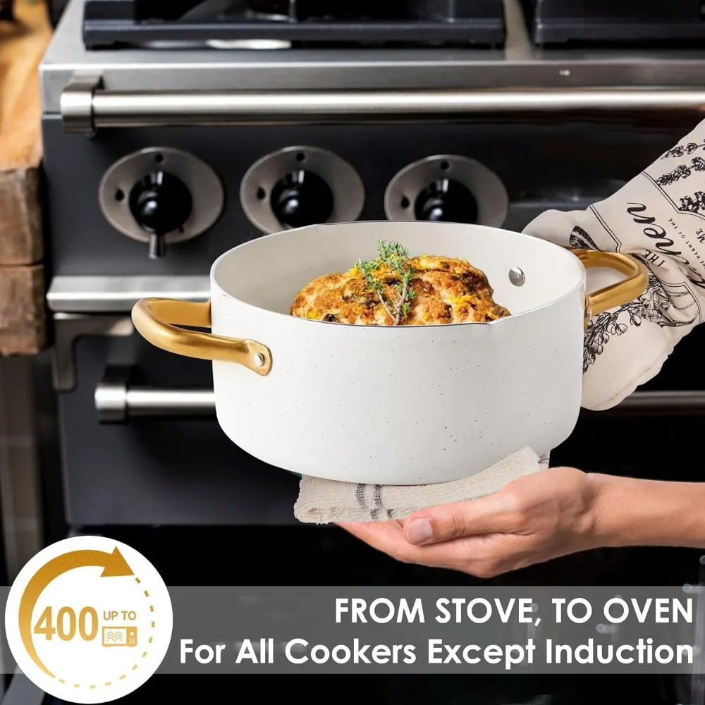 - 【For all Stovetops Except Induction】- The nonstick cookware set does not have a magnetic induction bottom, which allows faster heating on other cooktops, saving time and energy. Plus, oven safe up to 550°F, making cooking pot great for bread baking and roasts.