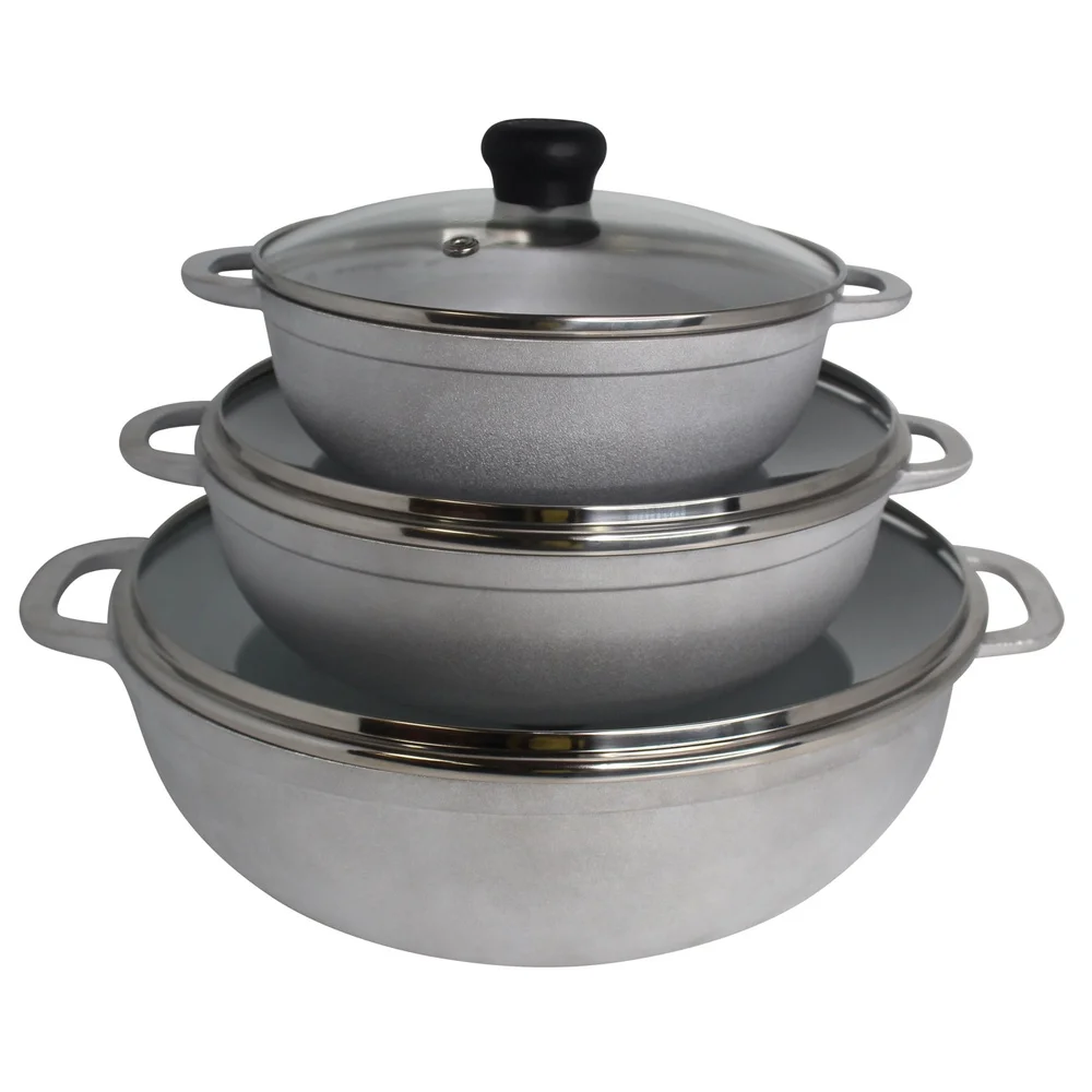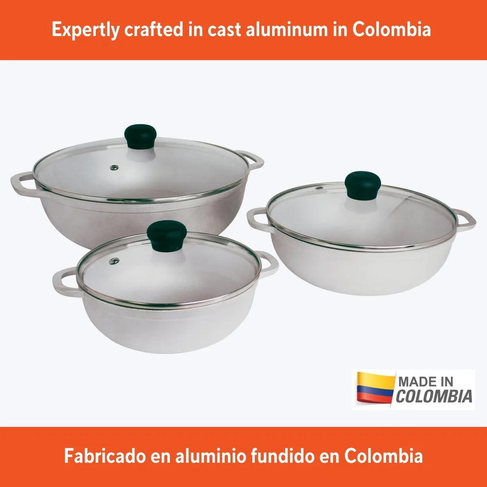 This set is manufactured in Colombia and is made of cast aluminum with a natural finish cooking surface that seasons over time. 5, 2. 5, and 5. 2Qt. The thick walls will deliver consistent and delicious results each time. With this versatile set, you can cook a variety of different meals. These calderos are also oven-safe without the lid, making them perfect for grilling and baking. After cooking, take this set straight from the kitchen to the table as stylish serving dishes. It will surely become your kitchen's beloved companion, uniting tradition, and innovation in every delectable creation. Elevate your culinary experience with this enduring symbol of Hispanic heritage.