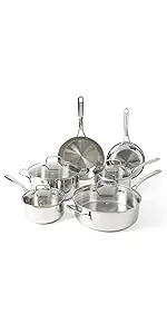 The Lockton 10-piece Aluminum Ceramic Nonstick Cookware Set from Martha Stewart is a contemporary suite of pots and pans accented with gold-colored stainless steel handles for a stylish cooking experience and presentation. Crafted from heavy-gauge aluminum, this impressive cookware heats and cooks evenly to whip up dishes with amazing flavors any time of the day. This collection beams with elegance inside out with a glossy enamel exterior to resist stains and a beauitful ceramic nonstick interior - made without PFOA and PTFE - to allow less oil and fat needed for easy food release and cleanup. Each pot and pan features riveted, gilded handles to offer a safe grip that is strong as it is luxurious. Vented, tempered glass lids complement each of the four pots perfectly as they seal in heat and moisture, bringing out the best, natural flavors while cooking. Built for style and function, this collection is safe to use on gas, electric, ceramic, and halogen stovetops. The pots and pans are oven safe up to 480°F, while the glass lids are safe up to 350°F. Dishwasher safe, hand wash recommended.