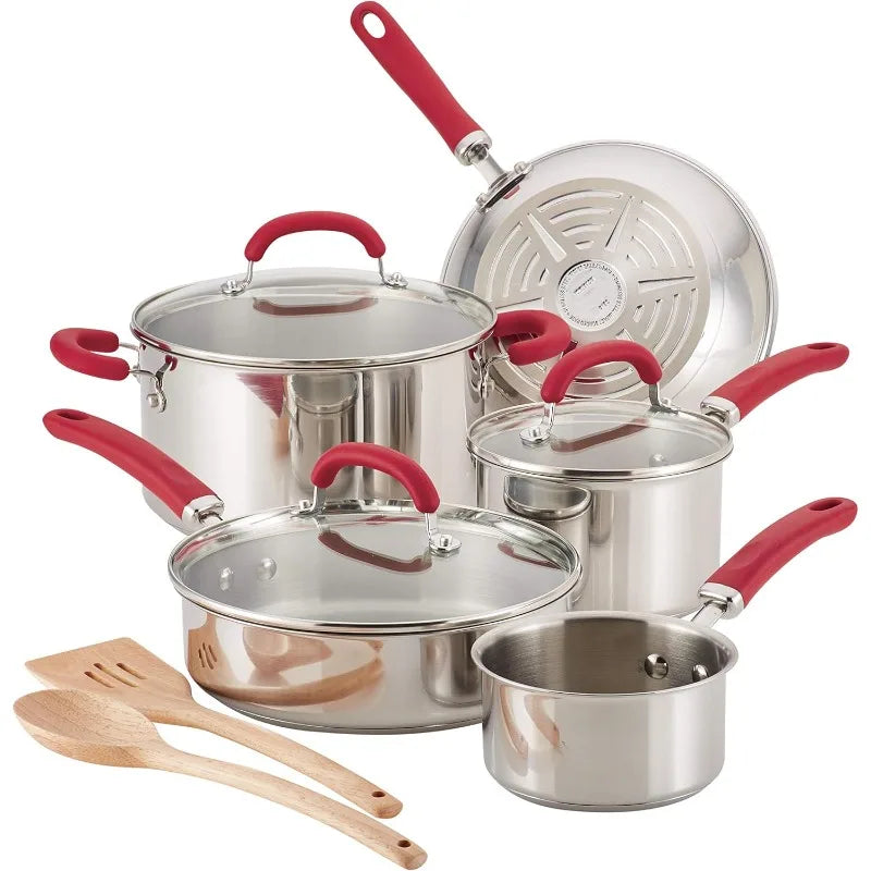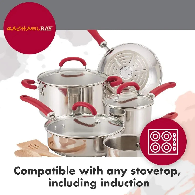 Rachael Ray Create Delicious Stainless Steel Cookware Set, 10-Piece Pots and Pans Set, Stainless Steel with Red Handles