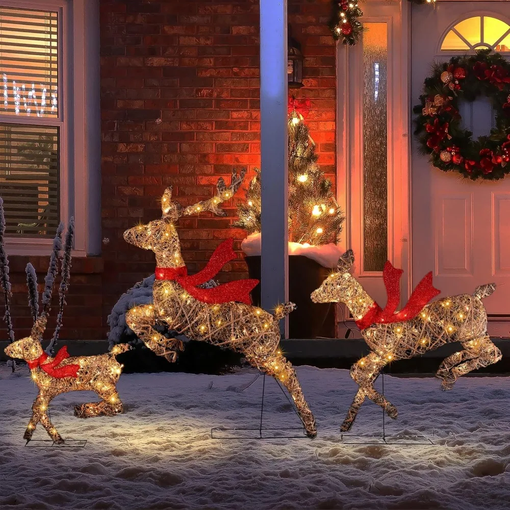 - Set of 3 Rattan Reindeer Decorations: This set of 3 rattan lighted reindeer Christmas decorations features a majestic reindeer family in a dynamic running position, with heights of 2 ft, 3 ft, and 4 ft, perfect for creating a lively and enchanting outdoor holiday display.