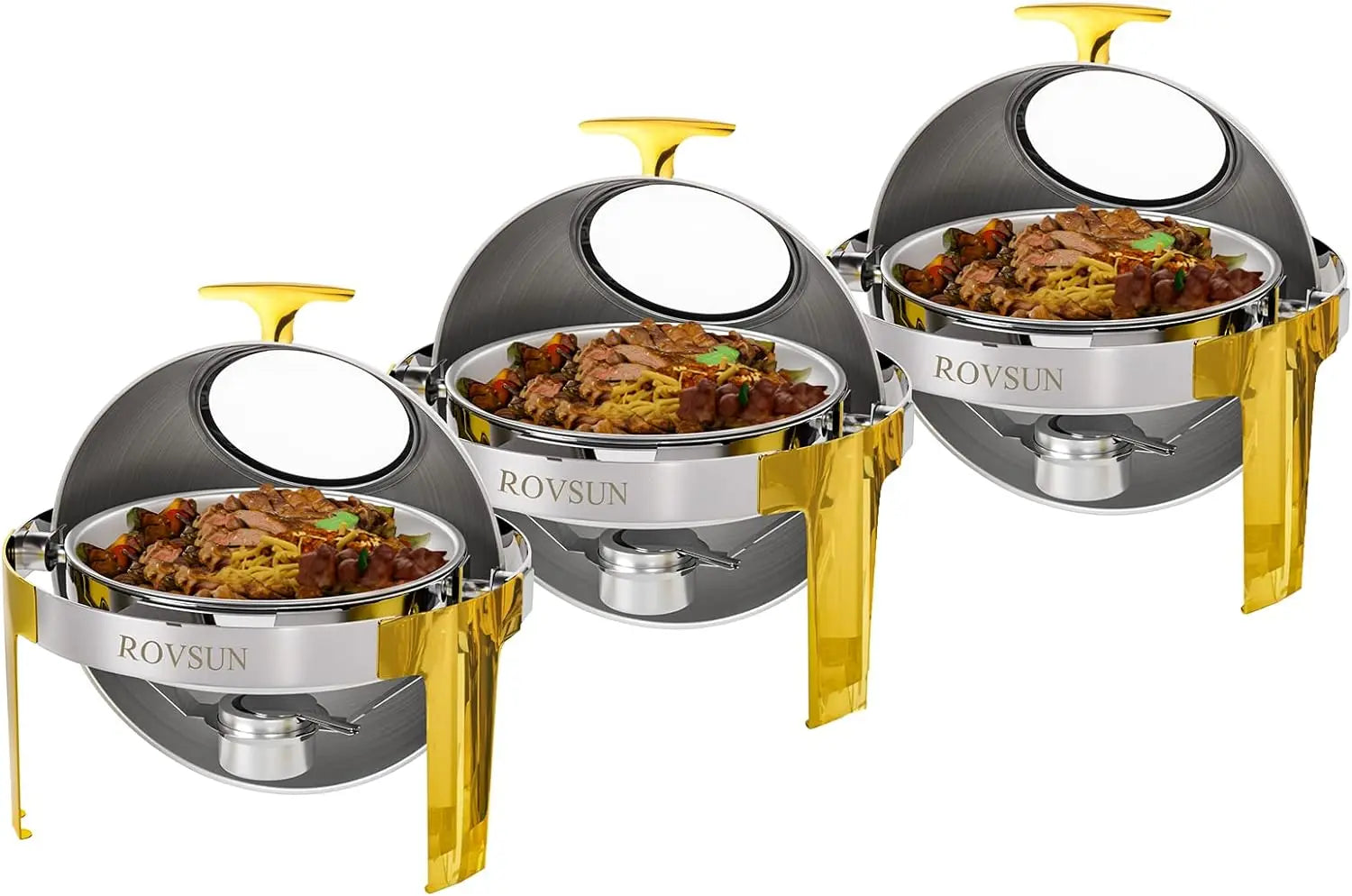 ROVSUN 3/2Packs Roll Top Chafing Dish Buffet Set Gold Accent,6 Quart Round Stainless Steel Chafer, Buffet Servers and Warmers