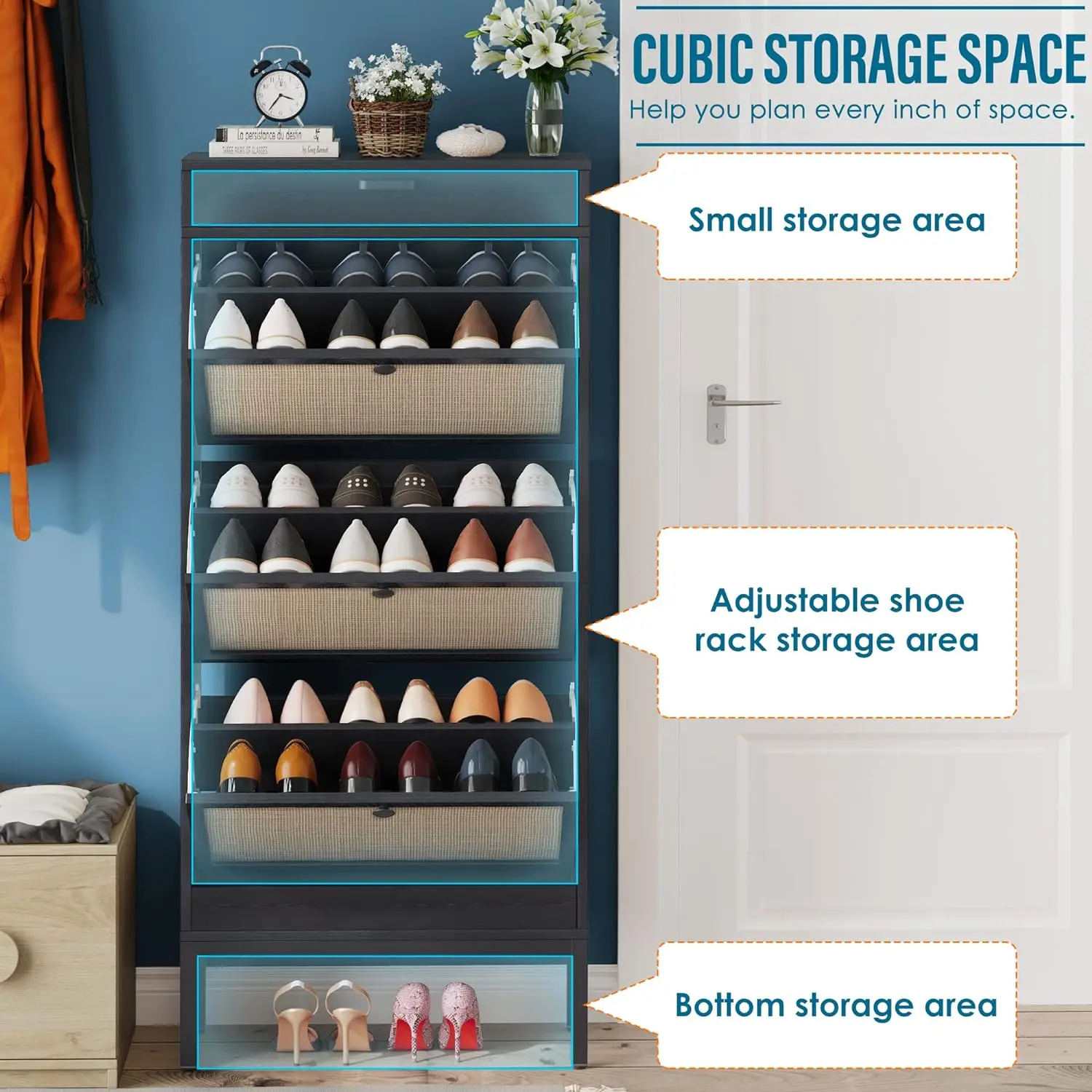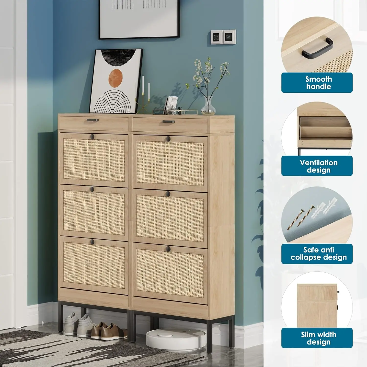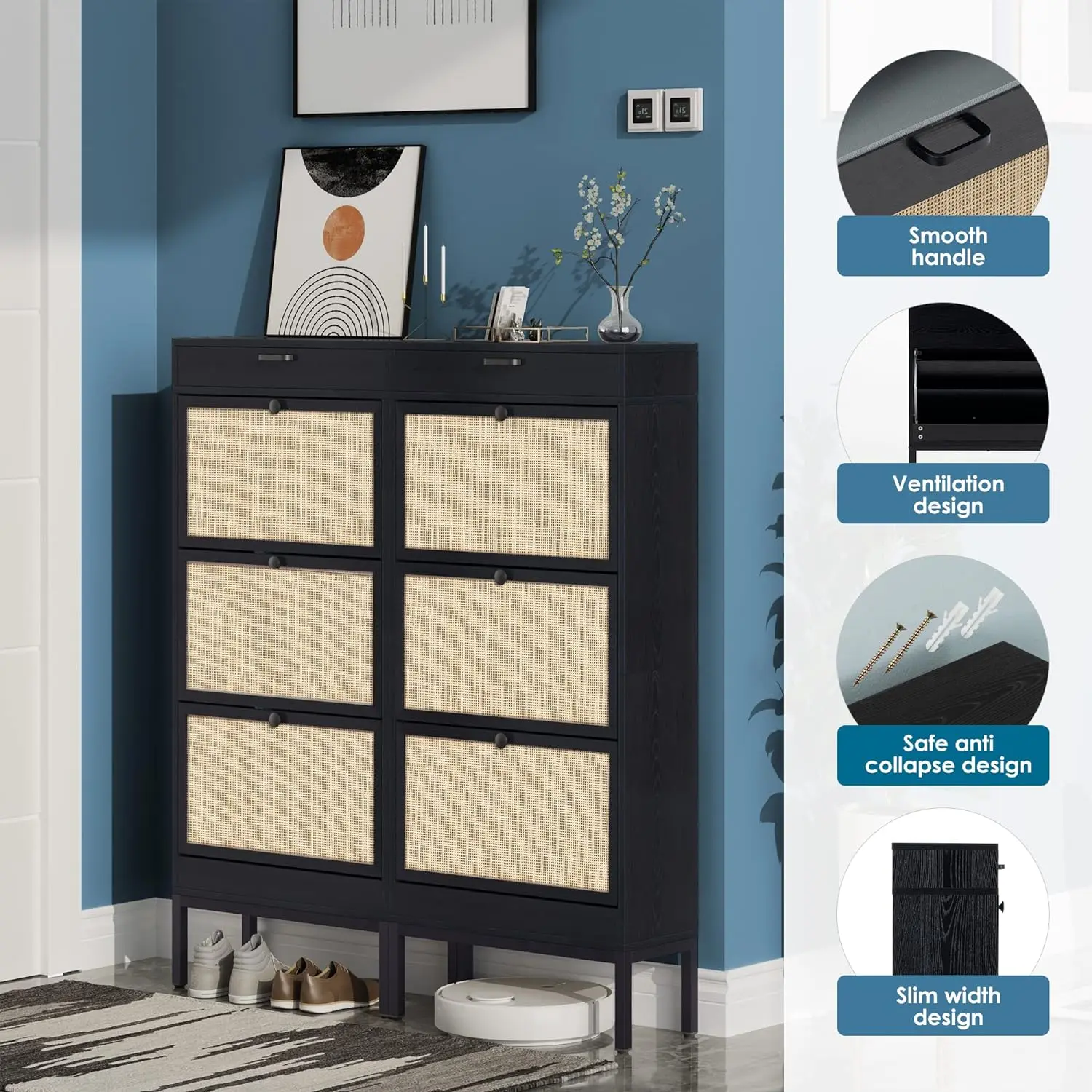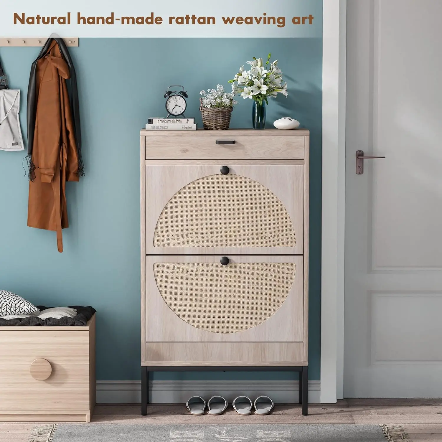 Shoe Storage Cabinet with 2 Flip Drawers&1 Small Drawer, Slim Entryway Shoe Organizer with Half Round Woven Rattan Doors