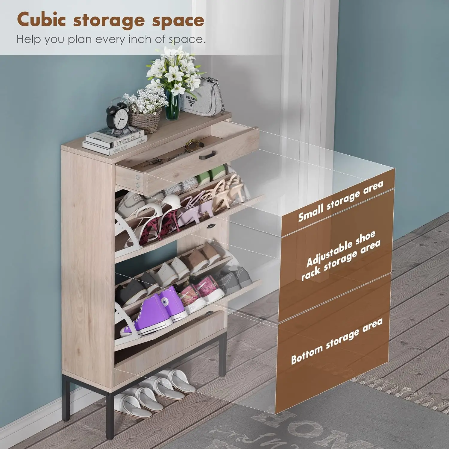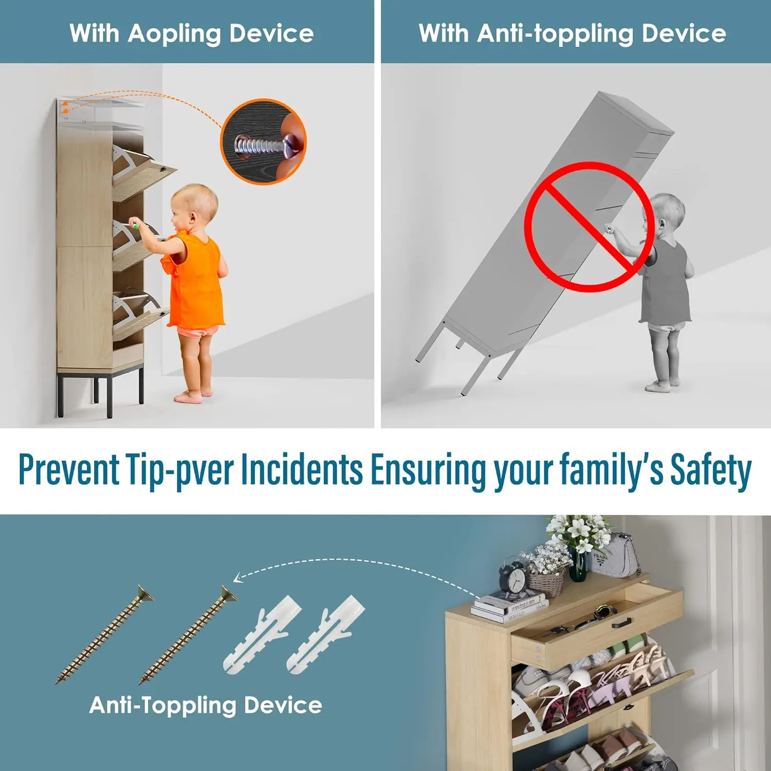 - 【User-friendly design】:Smooth handles are comfortable to touch and avoid scratching. Toppling preventing devices ensure safety when using the Freestanding shoe cabinet, while making the practical shoe cabinet and the wall fit better. The visually logical design of the flip drawer doors allows one to quickly find and remove shoes. Create a freestanding shoe cabinet from the user's perspective.