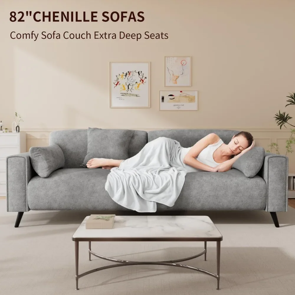 - 【Robust Frame Construction】This 82" modern 3-seater couch features a firm structure suitable for the living room and can support up to 900 lbs. Enhanced with high-density sprung foam cushions, it ensures unparalleled comfort, while the metal feet are crafted from non-slip material to guarantee the sofa's stability