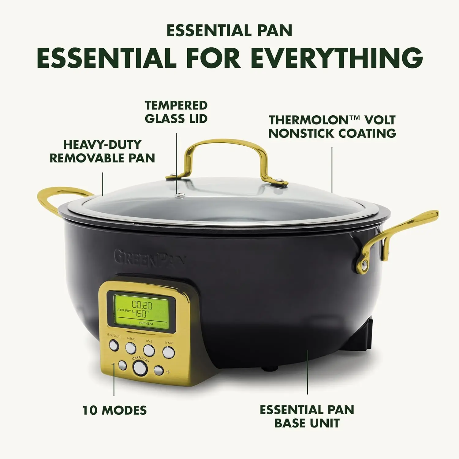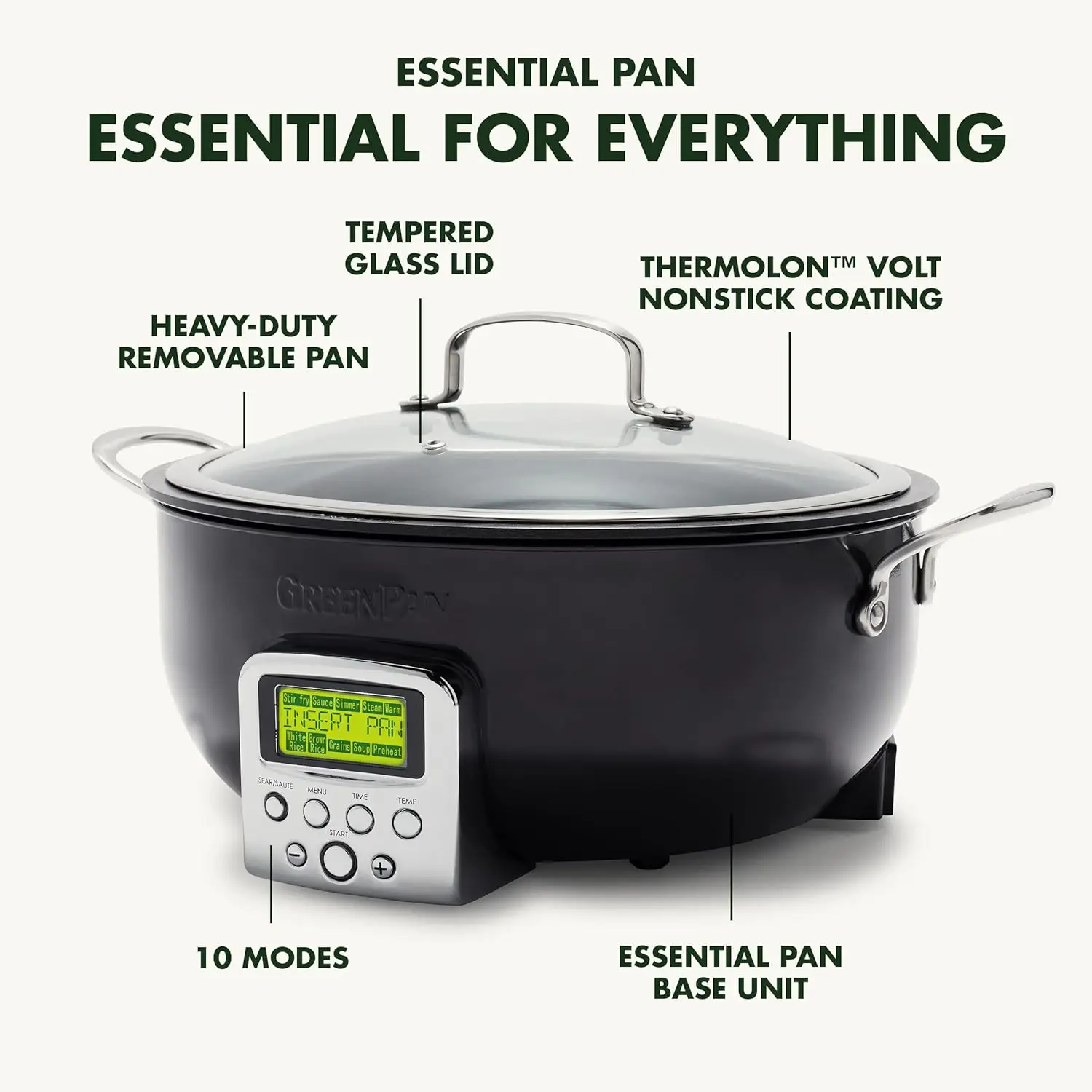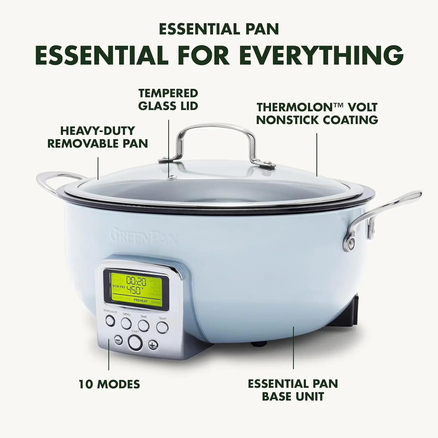 The Elite Essential Smart Skillet is the most versatile tool in any kitchen. Whether you're searing a steak, perfecting a complex stew, or simply making rice, this family-sized 6-quart pan gives you room for any meal. 10 modes to get every meal started right: Stir-Fry, Sauce, Soup, Steam, Simmer, Warm, Sear/Sauté, White Rice, Brown Rice, Grains. The high sides eliminate splatter and make it easy to toss your ingredients without worry. The cast-in element ensures quick and even heating, plus the removable pan pops out and rinses clean. The Essential Smart Skillet features a healthy ceramic nonstick coating specially designed for modern appliances and it's free of PFAS, PFOA, lead, and cadmium.