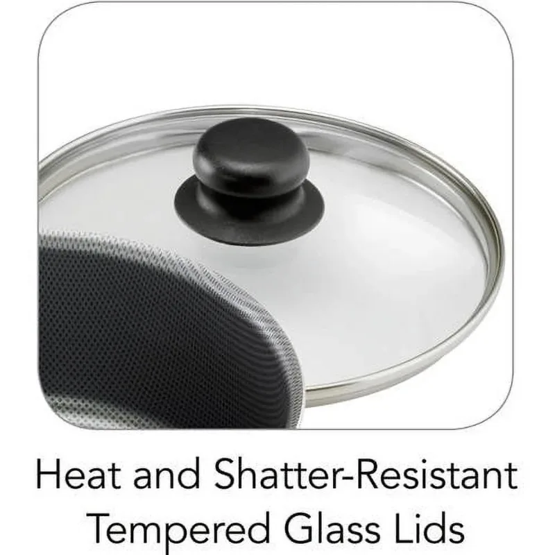 Heat- and shatter-resistant tempered glass lids allow easy monitoring of cooking progress10-piece nonstick cookware set is dishwasher safe