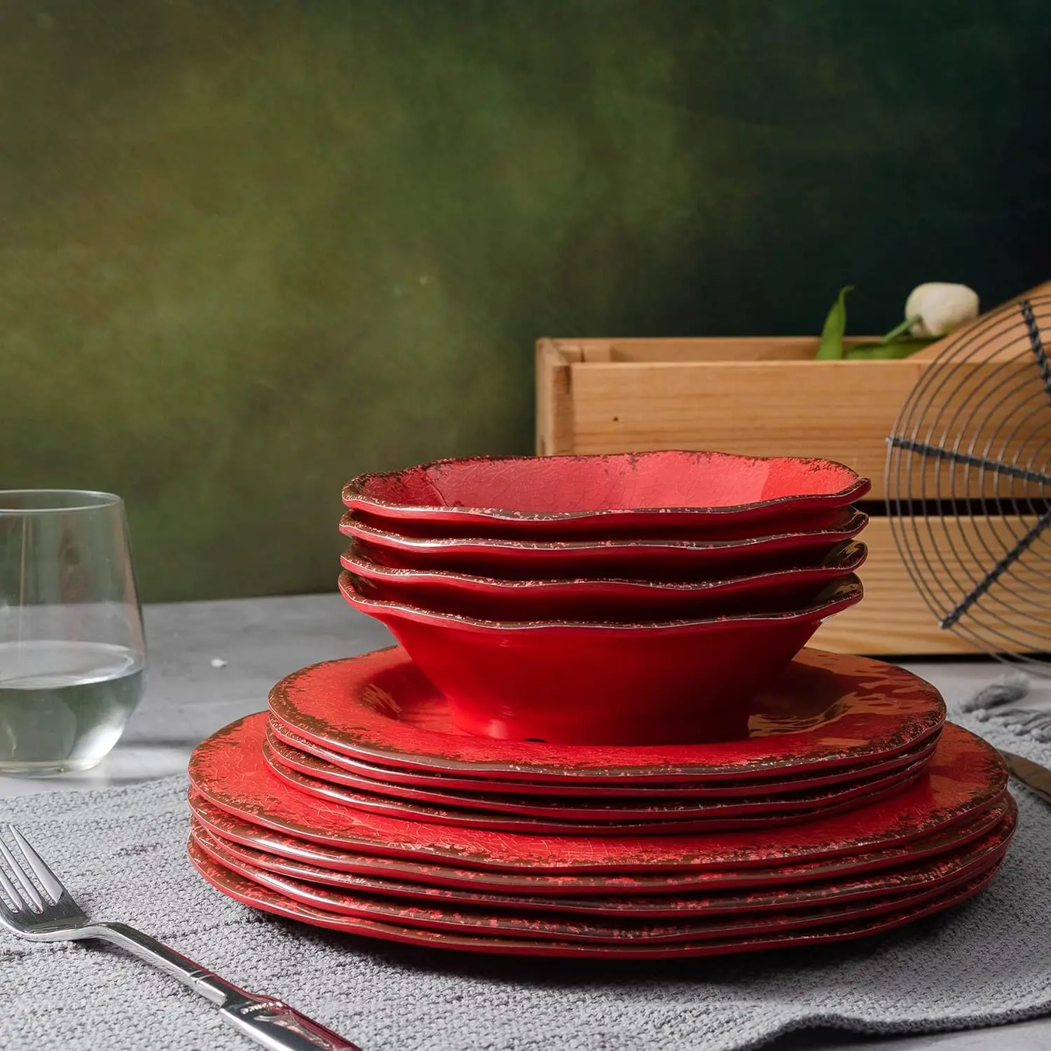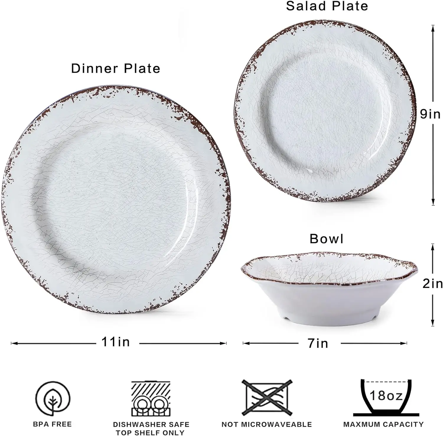 - VINTAGE DINNERWARE: The melamine dinner set includes 4 pcs 11"dinner plates, 4 pcs 9" salad plates, and 4 pcs 7" bowls, service for 4