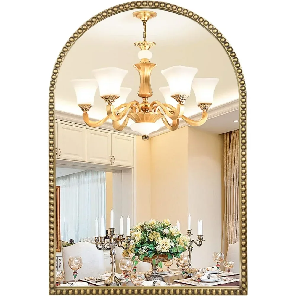 - 36"x24" Arch Wall Mirror - 24x36 inches mirror is the most standard size to put anywhere in your space. The large bathroom mirror, made of heavy duty strong cast iron with vintage gold finish, weighs 19.84 lbs. This sturdy, durable, anti-scratch, corrosion resistant and non-rusting mirror is ideal for bathroom.